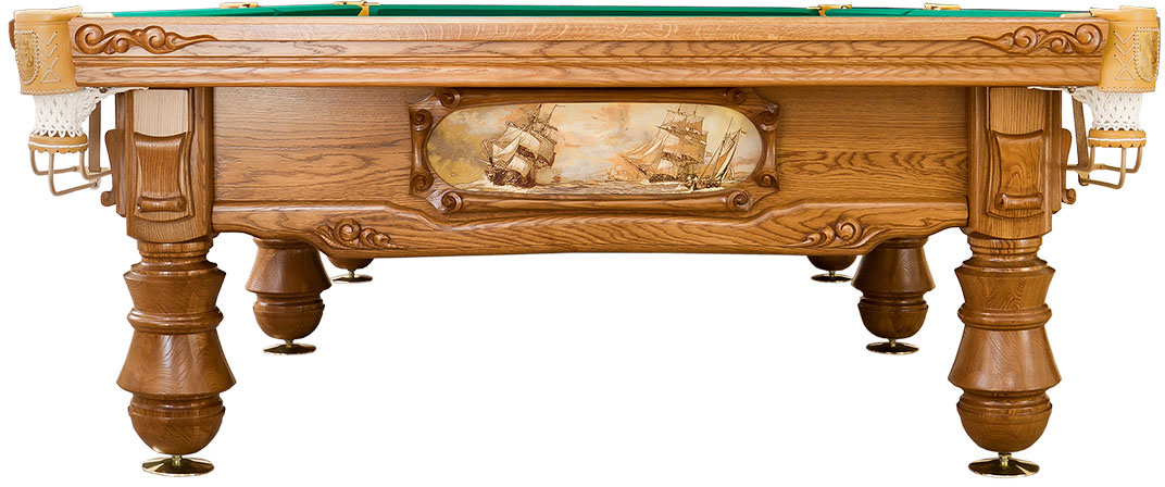 Великолепный бильярд с резьбой, повторяющей морские волны, и изображениями парусных кораблей прошлых столетий. Для всех, кто связан с морским делом или просто им увлечен. Стол изготавливается только больших размеров. Как говорится, большому кораблю – большое плавание.
