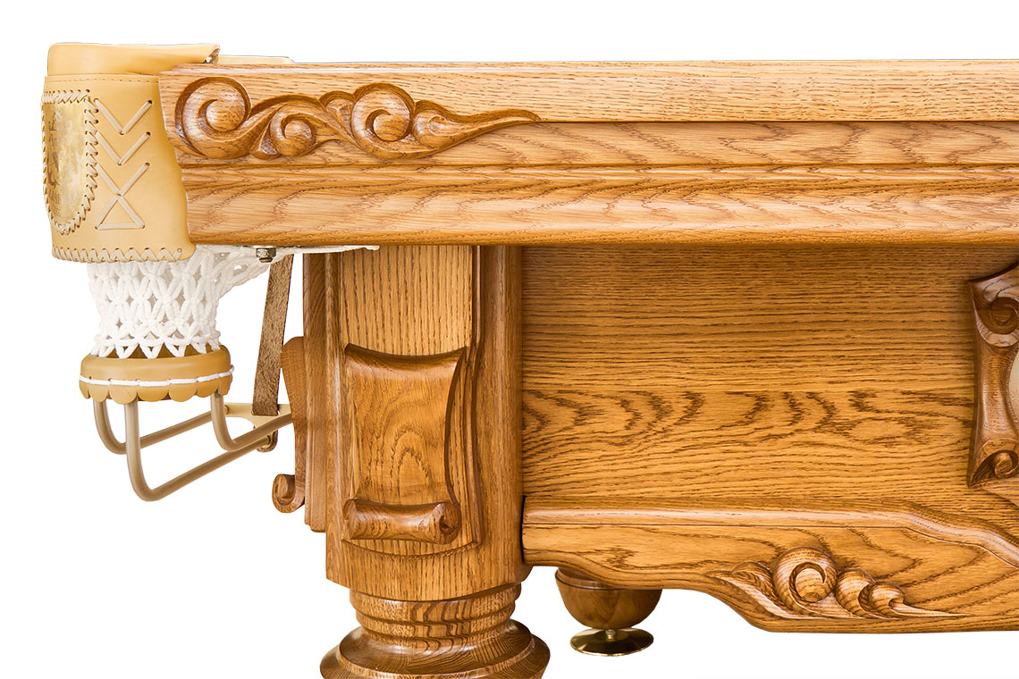Использование массива ясеня или дуба, богатый декор и кожаные лузы индивидуального изготовления со шнуровкой и брендированным логотипом — традиционные составляющие коллекционных бильярдов «Руптур». Киевница и светильник из одноименной коллекции — аксессуары, позволяющее оформить игровое помещение в оригинальной морской стилистике.