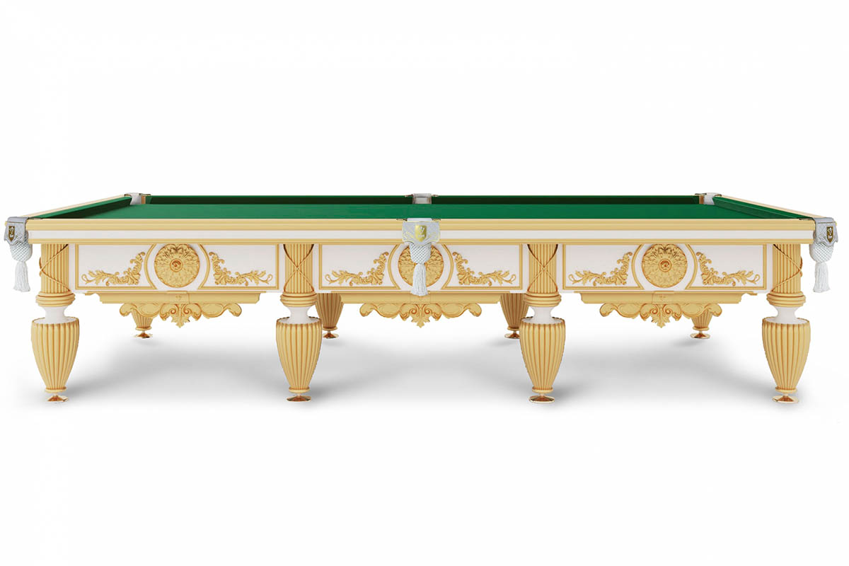 Стол эксклюзивного уровня выполнен из граба и собран из лучших комплектующих. Шульцевское крепление ног гарантирует максимальную устойчивость конструкции. В основе игрового поля — натуральный сланец Orero толщиной 45 мм. Профессиональные амортизаторы бортов Start Super Pro надолго обеспечит отличный отскок шара. В стандартную комплектацию входит сукно с высокими эксплуатационными характеристиками бренда Manchester. Авторская Выкраска стола выполнена в авторской технике с применением золотой потали.