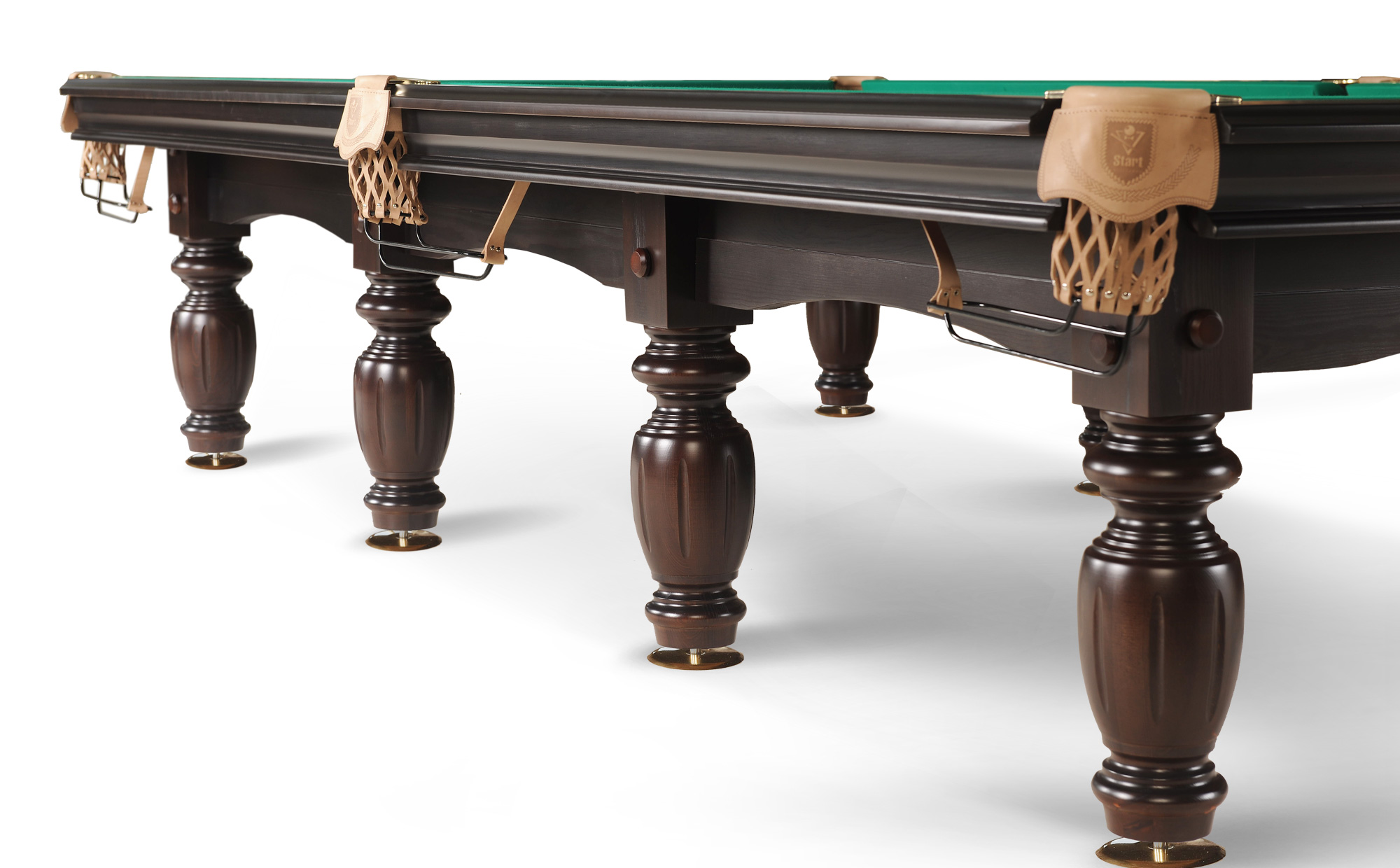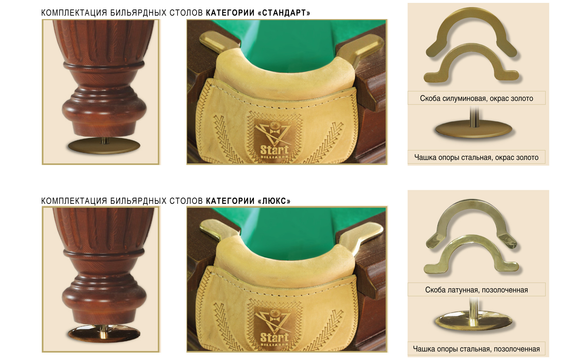 Модель стола имеет два вида комплектации, отличающихся чашками опор и скобами луз.