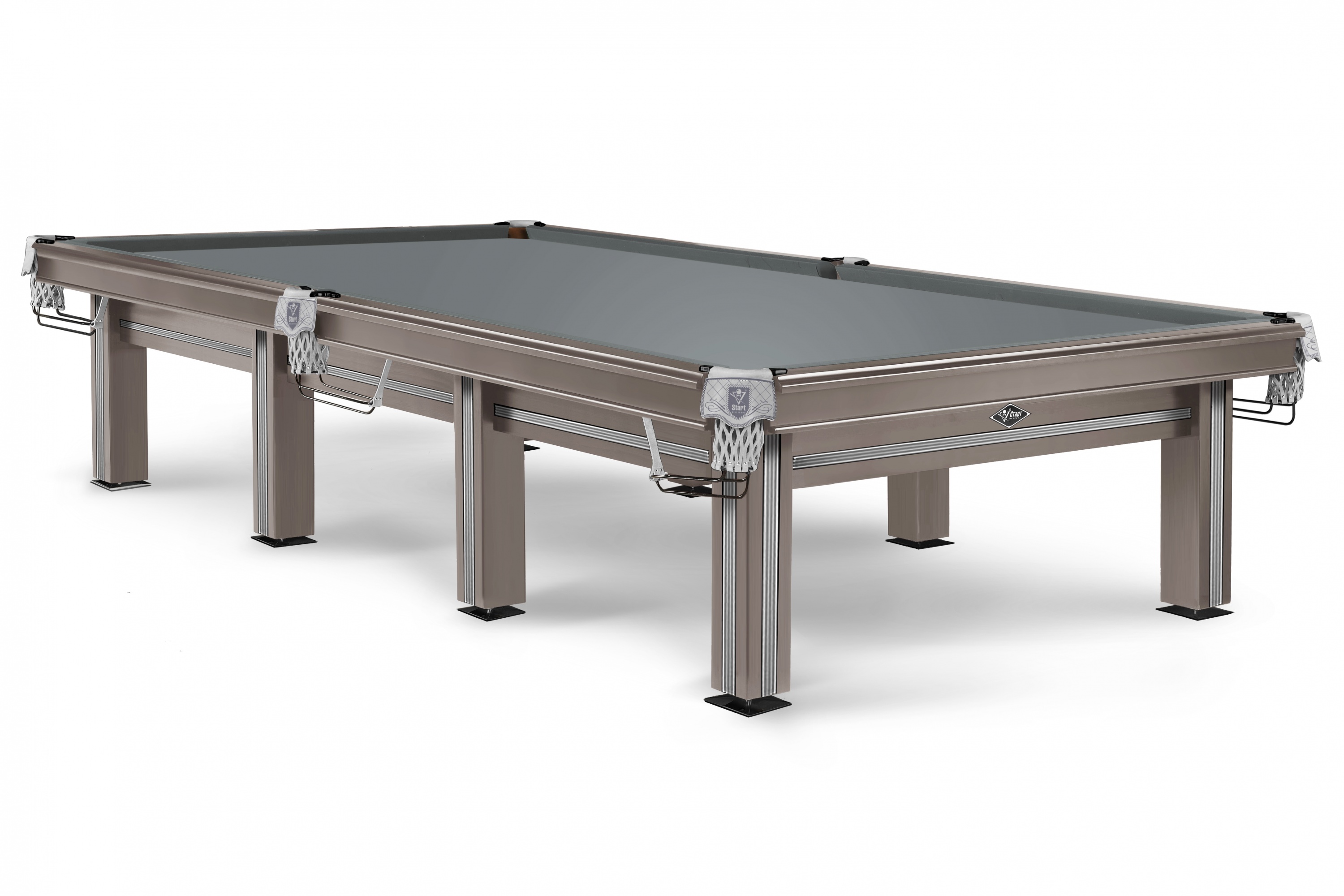 Модель стола имеет два вида комплектации, отличающихся чашками опор и скобами луз.