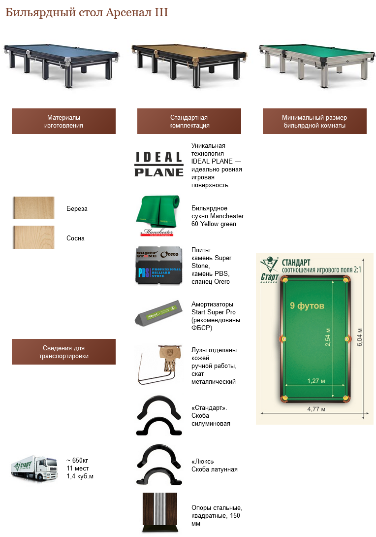 Бильярдный стол «Арсенал III» отвечает всем требованиям, предъявляемым к профессиональным столам для бильярда. «Арсенал III» представляет сочетание высоких игровых качеств в лаконичном внешнем виде.