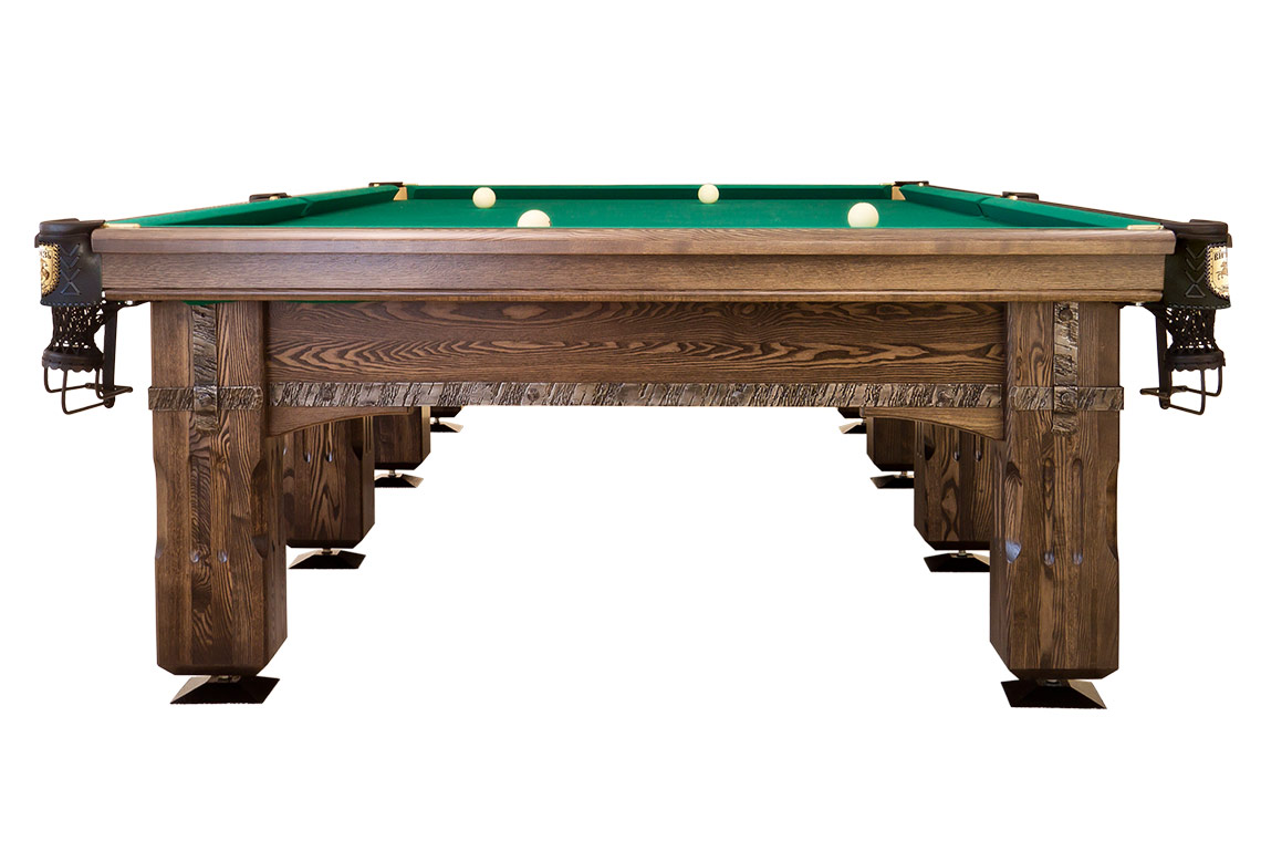 Внушительные деревянные элементы из массива дуба или ясеня дополнены железными накладками, напоминающими оковку огромного сундука. Квадратные латунные опоры — цвета благородной старины. Коллекционный стол «Витязь-Премиум» в сочетании со светильником и киевницей одноименной серии обеспечат максимальный комфорт от игры и удовольствие от оформления бильярдной комнаты.