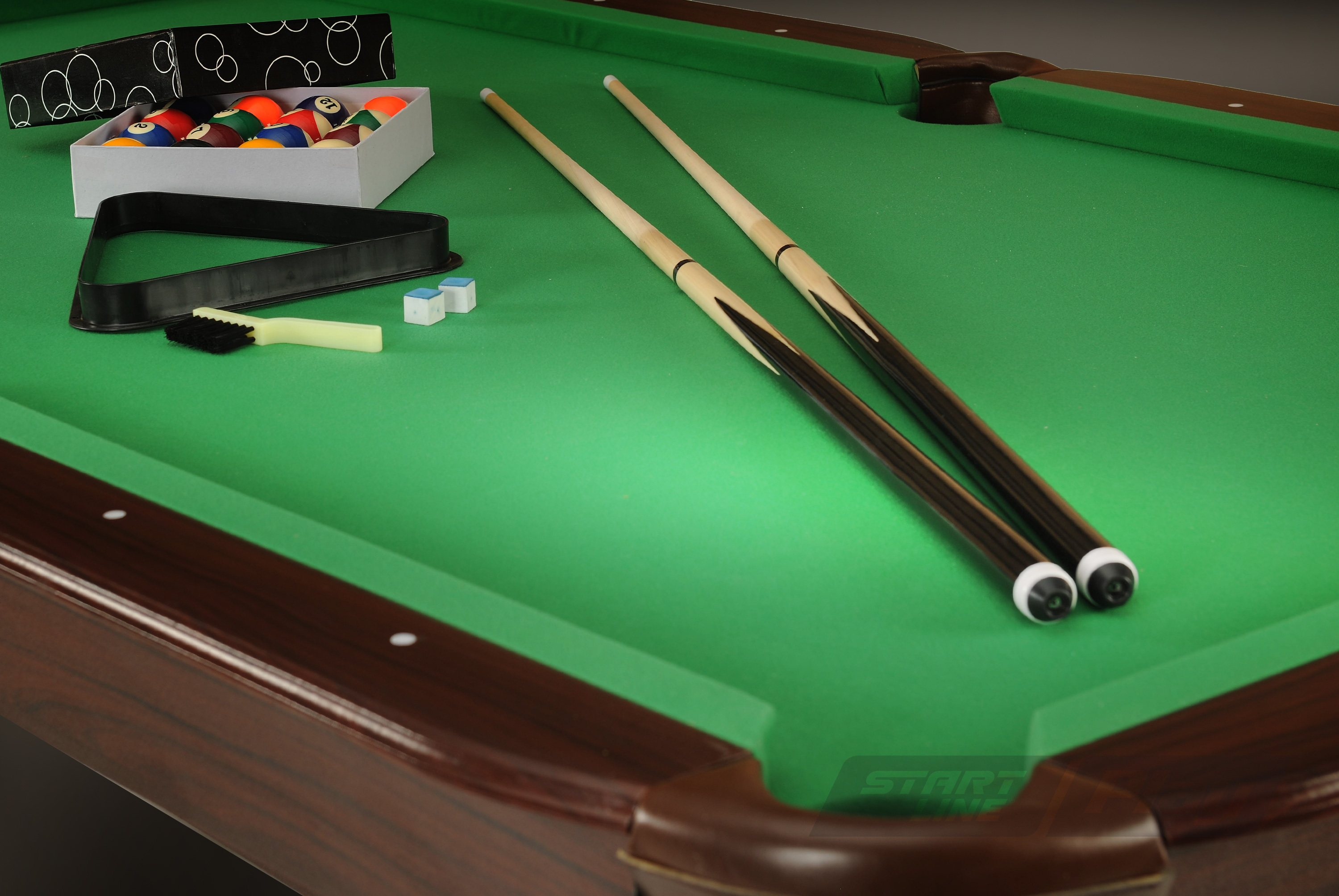 «Бруклин» –  игровой стол для бильярда Start Line Play имеет универсальный дизайн и качественную отделку. Модель отличают массивные трапециевидные ноги, придающие столу дополнительную устойчивость. В основе игрового поля лежит МДФ. Поставляется с полностью собранной верхней частью. В комплект входят: 1 набор шаров, 2 кия, 2 мела, 1 треугольник, 1 щетка.