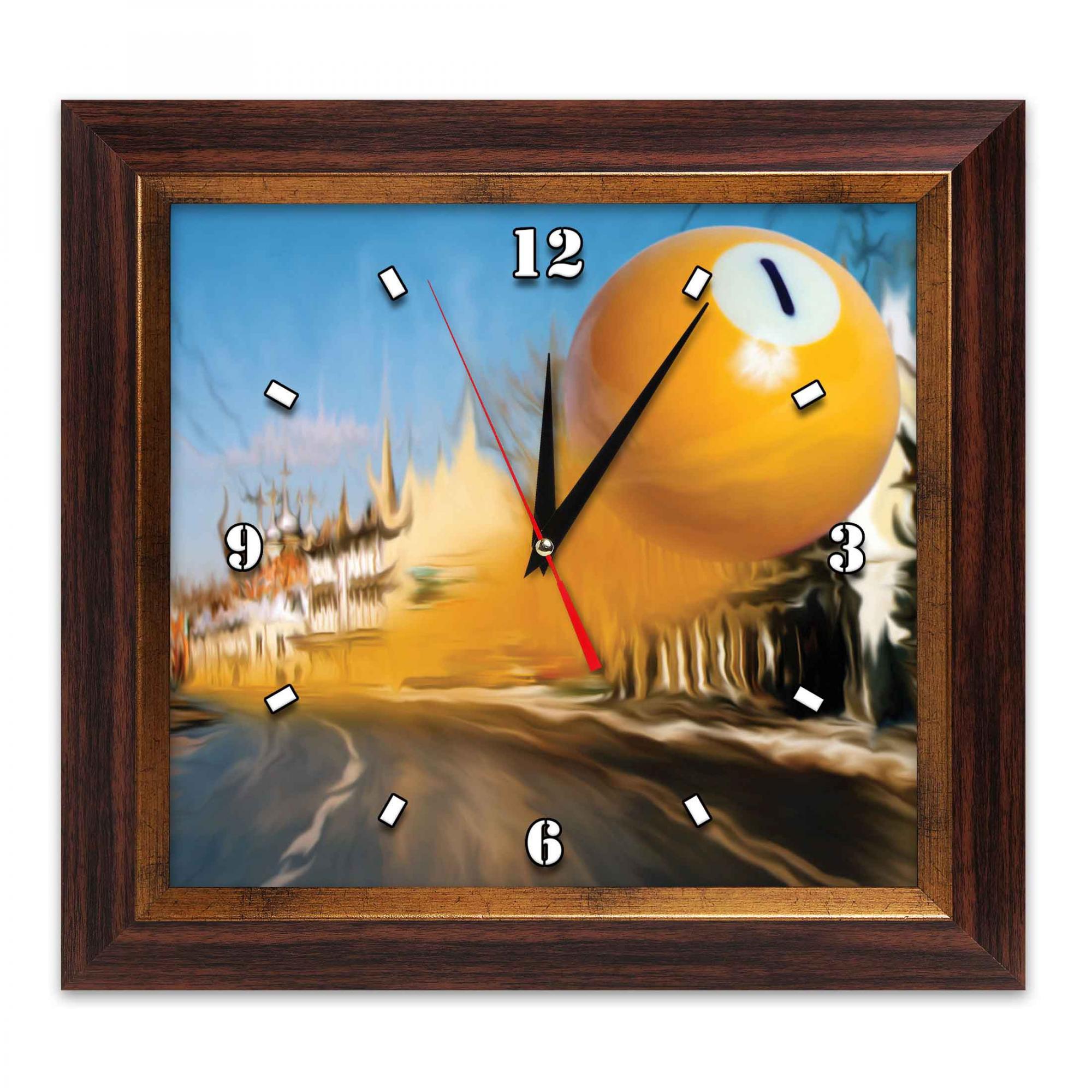 Настенные кварцевые часы выполненные по мотивам известных постеров на бильярдную тематику. Часы квадратной формы, в строгой рамке под дерево. Кроме часовой и минутной, имеется секундная стрелка красного цвета.