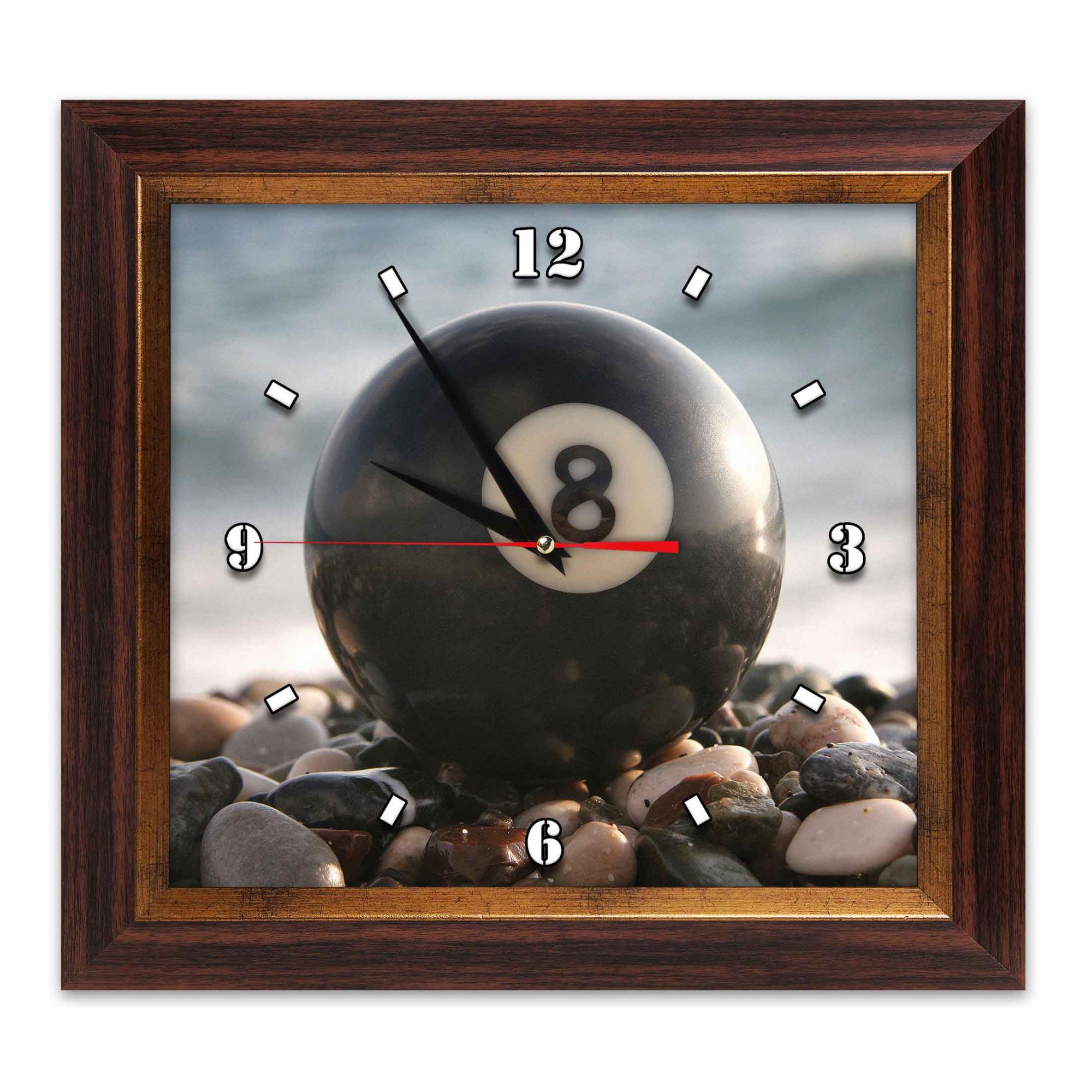 Настенные кварцевые часы выполненные по мотивам известных постеров на бильярдную тематику. Часы квадратной формы, в строгой рамке под дерево. Кроме часовой и минутной, имеется секундная стрелка красного цвета.