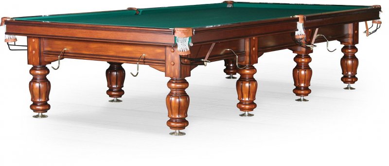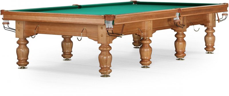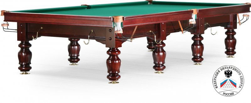 Бильярдный стол классического дизайна для пирамиды. Конструкция стола включает в себя ряд новейших разработок, используемых в производстве бильярдного оборудования, что поднимает эту модель на новый уровень качества, долговечности и профессионализма. Рама и ножки стола изготовлены из переклеенных брусков твердых пород дерева, что обеспечивает прекрасную жесткость и отличную устойчивость к перепадам температур. Каждая из ножек крепится к боковой части рамы (царге) двумя болтами, снабженными шайбами специальной формы, которые не позволяют каркасу стола расшатываться в процессе эксплуатации. Ширина борта, изготовленного из массива твердых пород дерева, увеличена с распространенных 90 мм до 100 мм, а длина крепежного болта до 120 мм., что позволяет игроку полностью контролировать траекторию движения шаров.