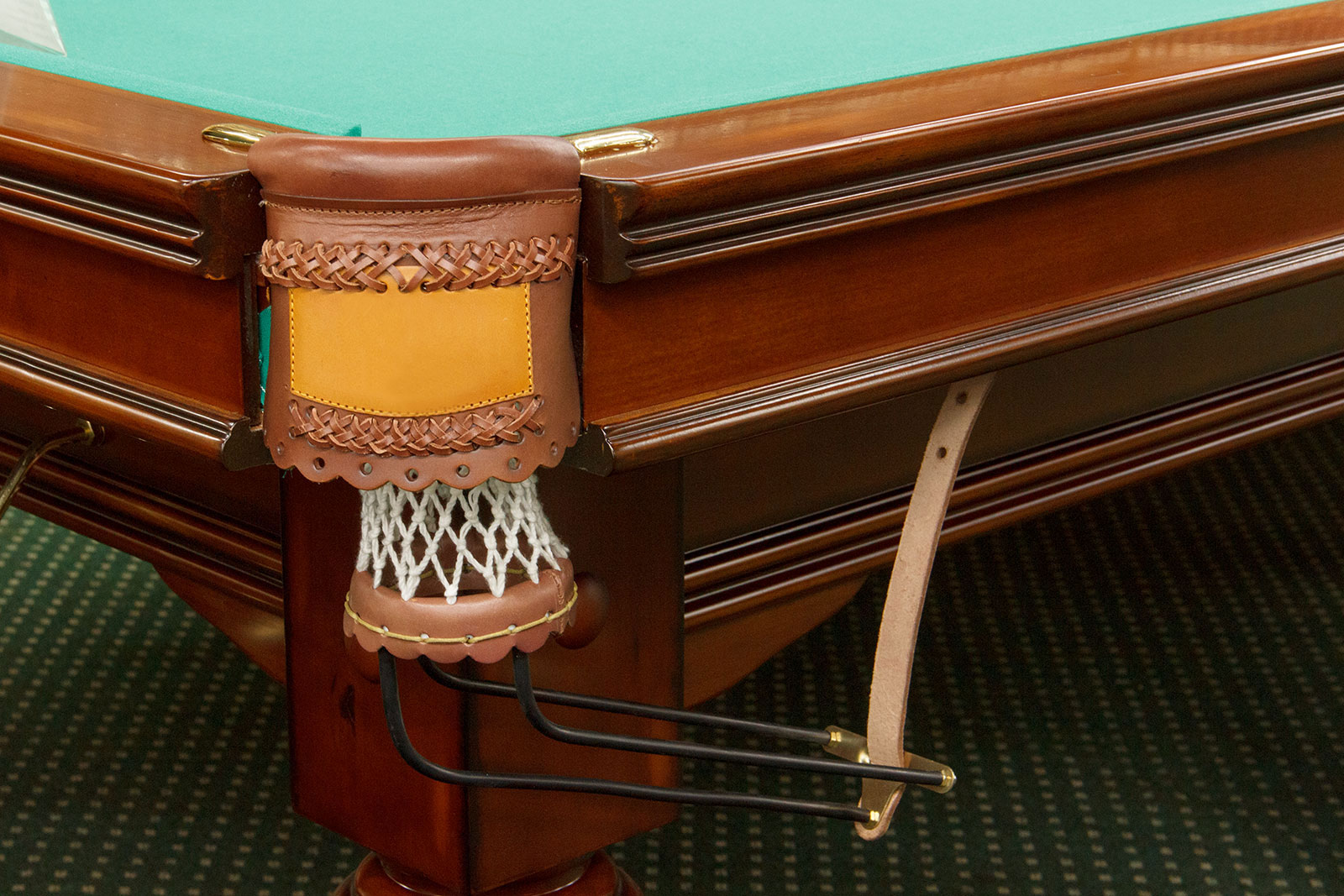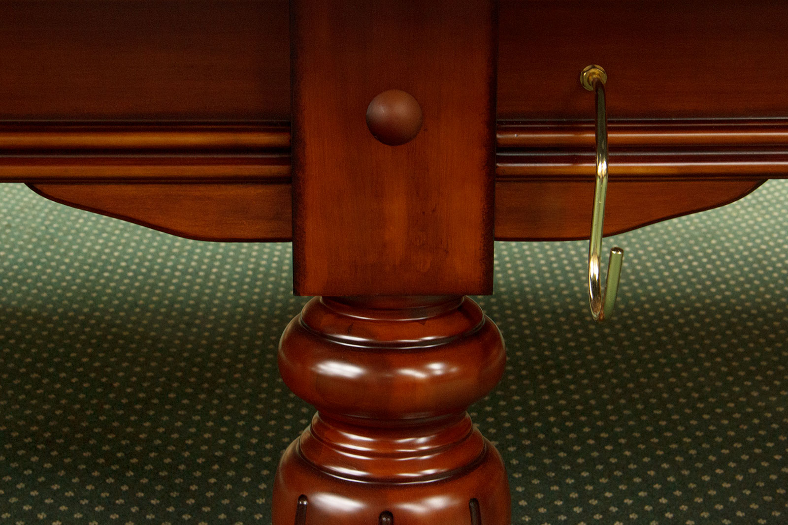 Бильярдный стол классического дизайна для пирамиды. Конструкция стола включает в себя ряд новейших разработок, используемых в производстве бильярдного оборудования, что поднимает эту модель на новый уровень качества, долговечности и профессионализма. Рама и ножки стола изготовлены из переклеенных брусков твердых пород дерева, что обеспечивает прекрасную жесткость и отличную устойчивость к перепадам температур. Каждая из ножек крепится к боковой части рамы (царге) двумя болтами, снабженными шайбами специальной формы, которые не позволяют каркасу стола расшатываться в процессе эксплуатации. Ширина борта, изготовленного из массива твердых пород дерева, увеличена с распространенных 90 мм до 100 мм, а длина крепежного болта до 120 мм., что позволяет игроку полностью контролировать траекторию движения шаров.