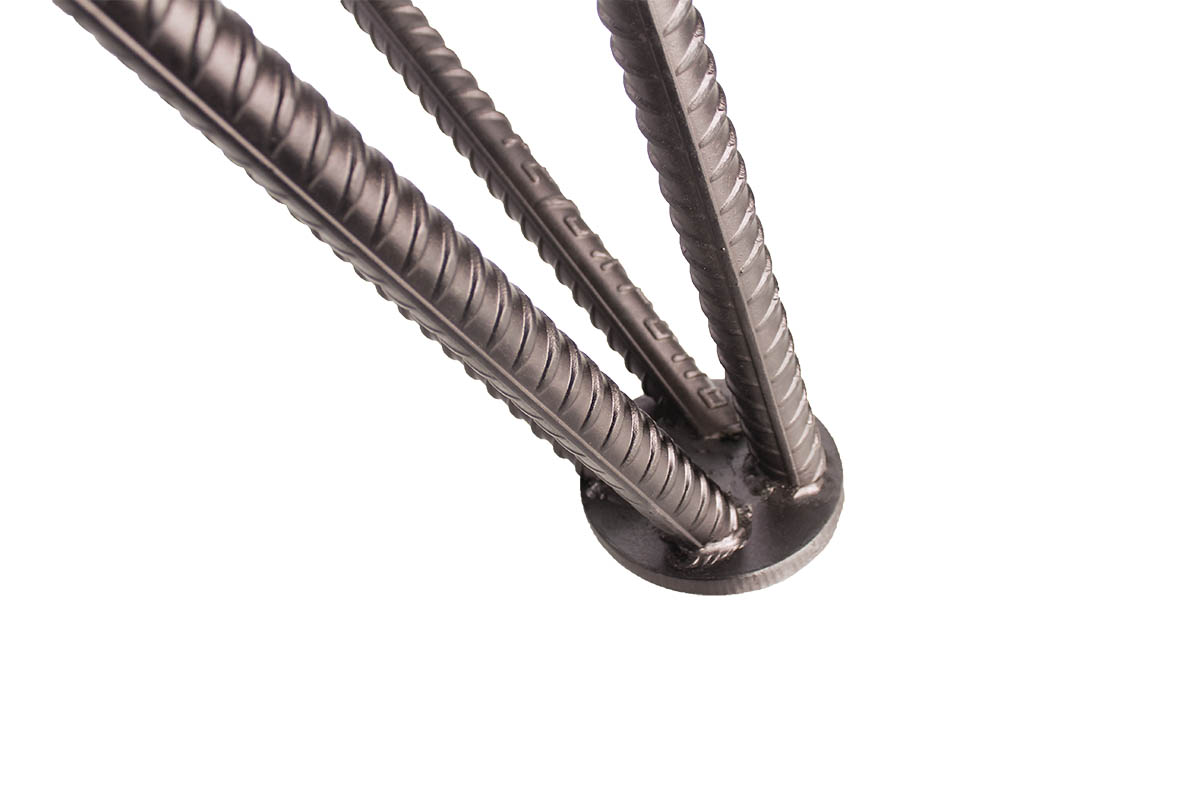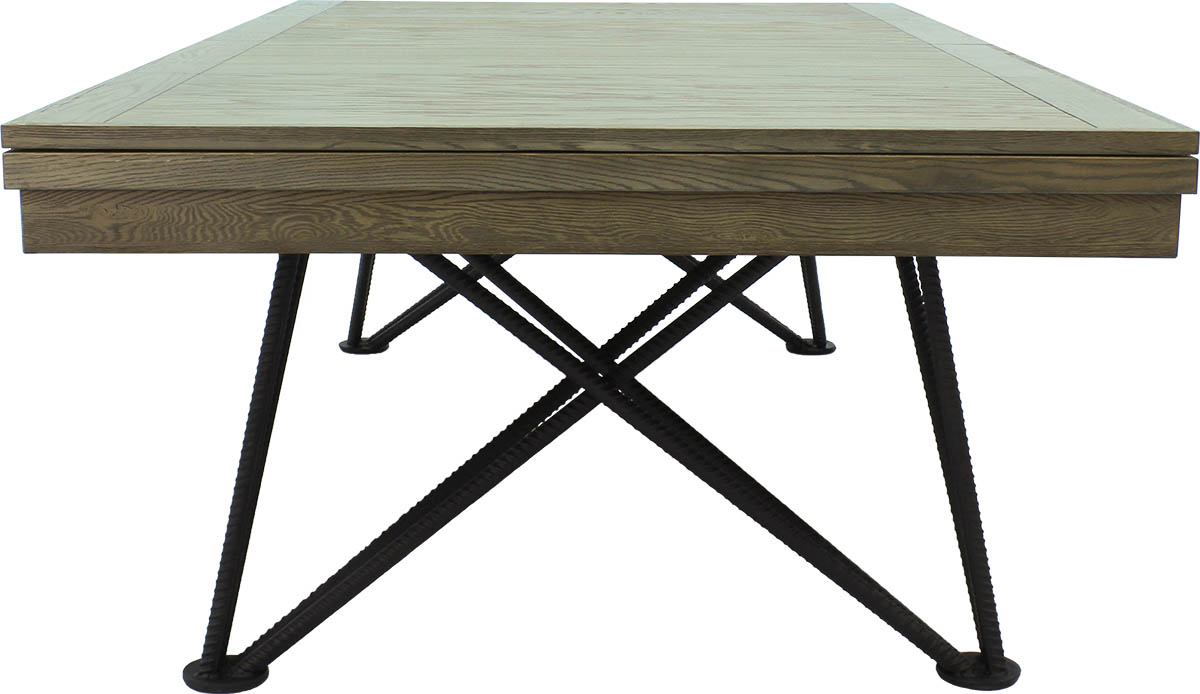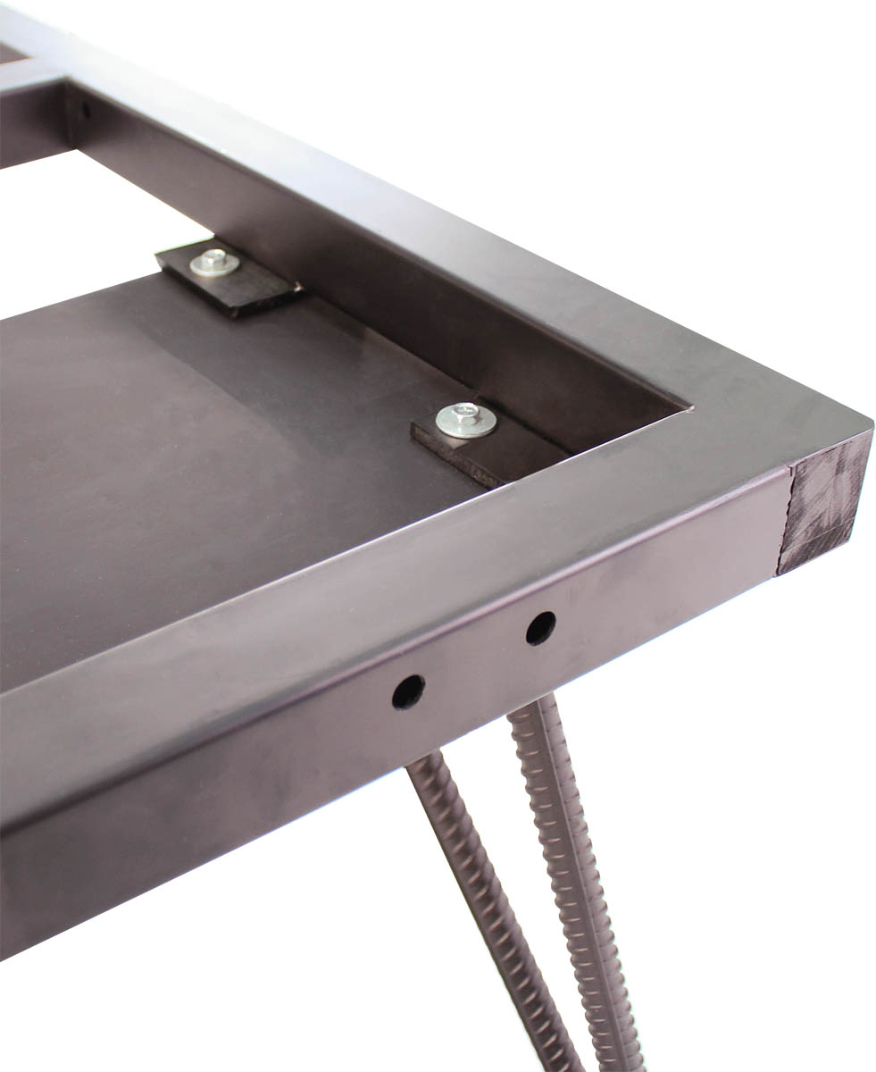 Стол сделан из древесины твердых пород с металлической рамой.