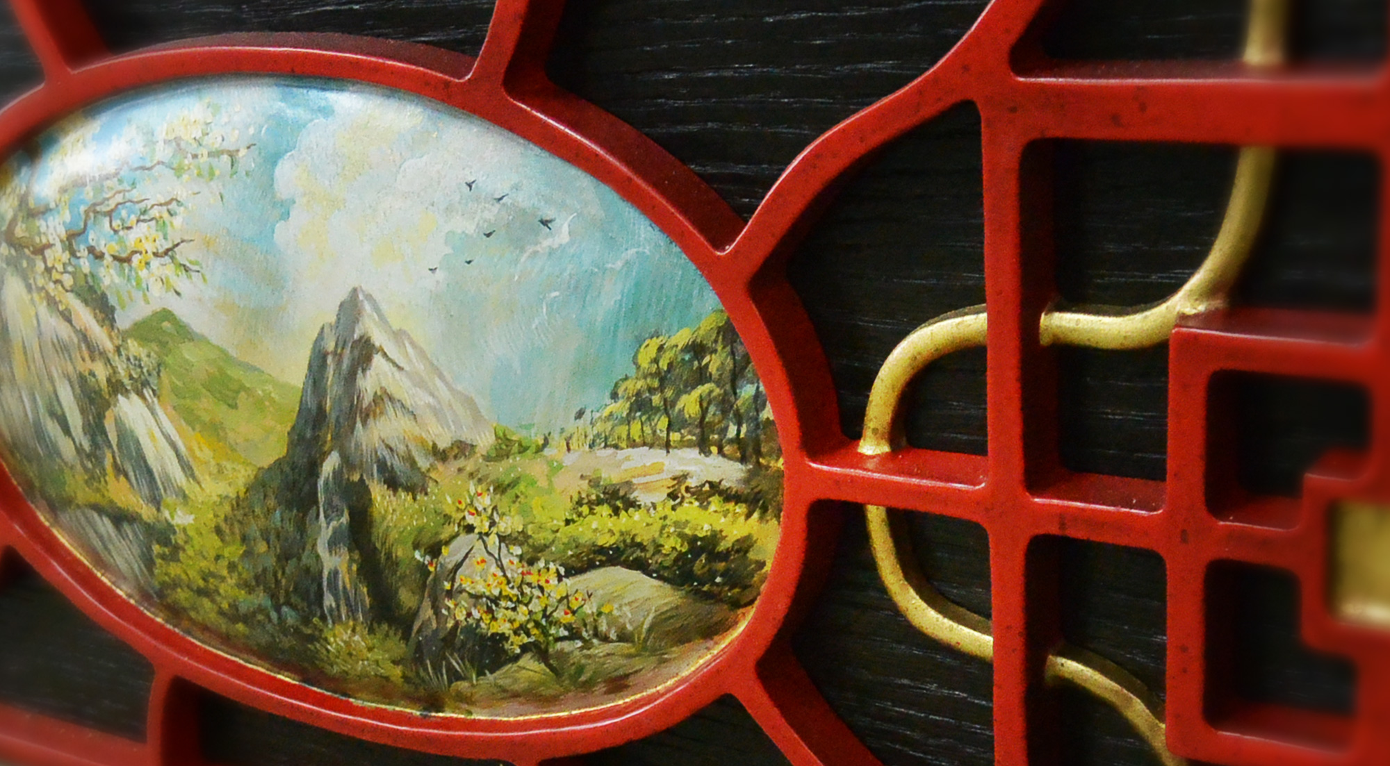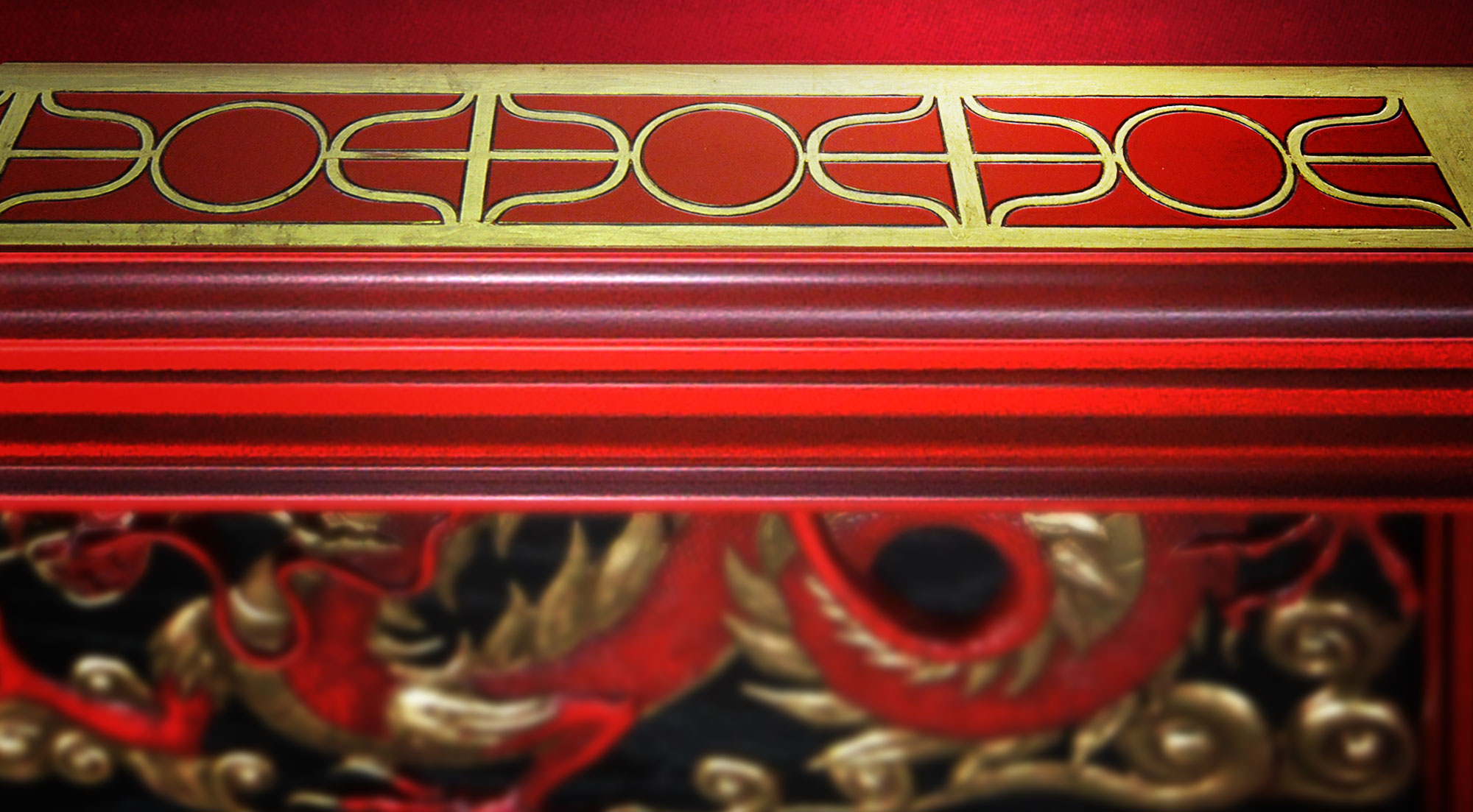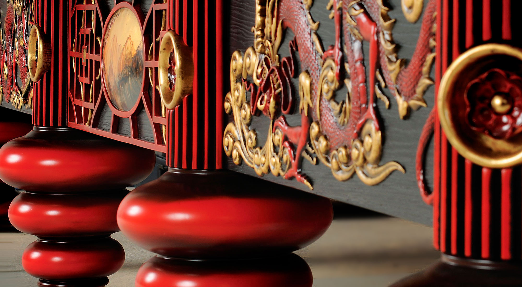 Говоря о дизайне «Дракона», стоит заметить, что вся поверхность стола патинируется в авторской технике. Барельеф лафета декорирован с помощью цветной смолы и золотой потали. Интересен тот факт, что отделка стола подбиралась нашими специалистами с учетом традиционных технологий, известных еще с древних времен. Так, например, покрытие в несколько слоев лака дает особую глубину, богатство и насыщенность цвета. Брашированное дерево на лафете приобретает дополнительную фактурность, графичность волокна. Отливка фигур драконов выполняется по авторским образцам, которые изготавливаются скульпторами, владеющими тонкостями китайского стиля.