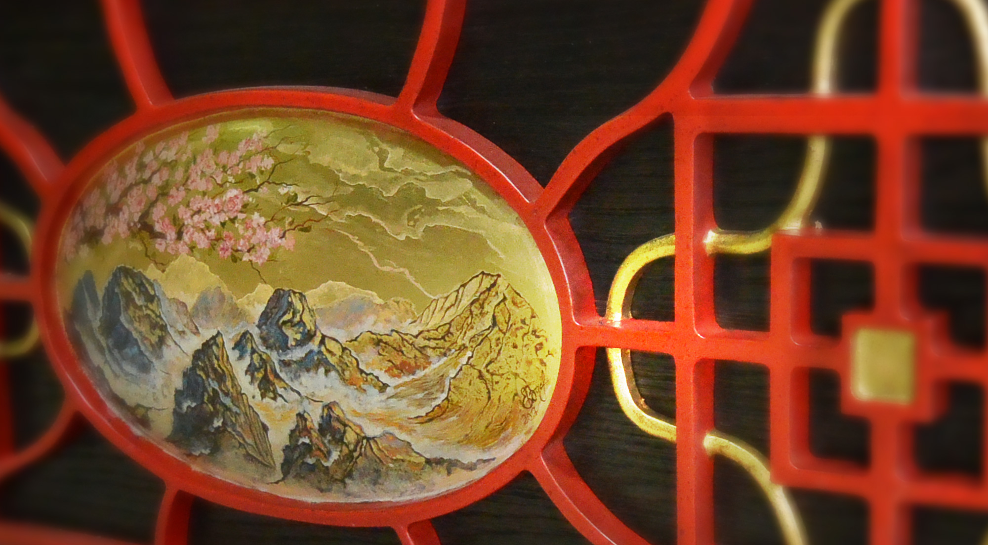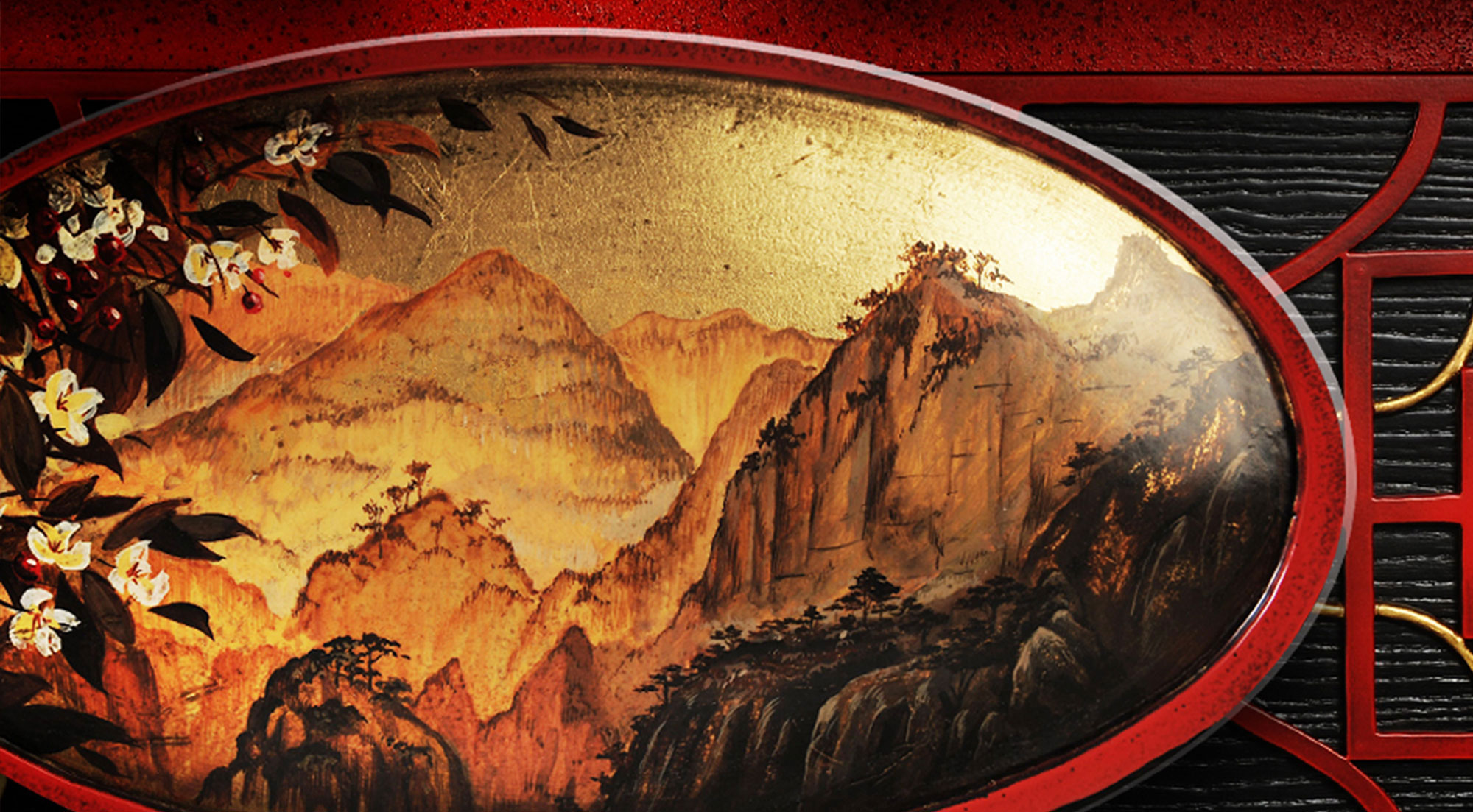 Для росписи панно, расположенного в центре лафета, мастера Фабрики используют специальные минеральные краски. Работа выполняется вручную. Применение подобной технологии нанесения красок создает эффект росписи по шелку.