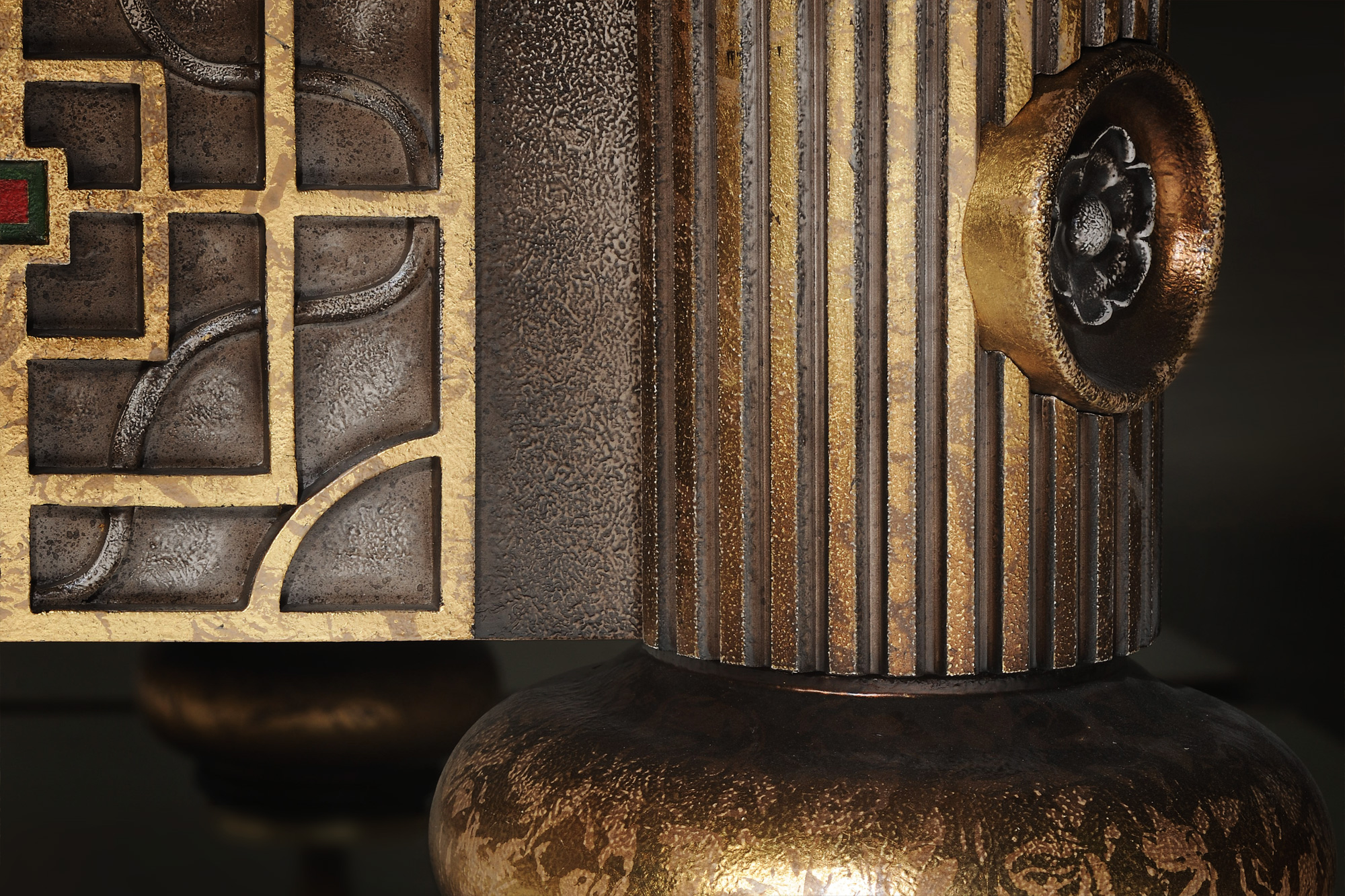 Изюмина «Дракона Гранж» – в уникальной выкраске, которая выполняется вручную с помощью нанесения золотой потали и многослойной колеровки. Благодаря этому поверхность стола приобретает неповторимую фактуру и глубину цвета, создается полное ощущение, что изделие изготовлено не из натурального дерева, а из металла. Лафет из граба украшают замысловатые фигурки драконов, каждый из которых вырезан вручную. Богатый рельеф напоминает искусную чеканку.