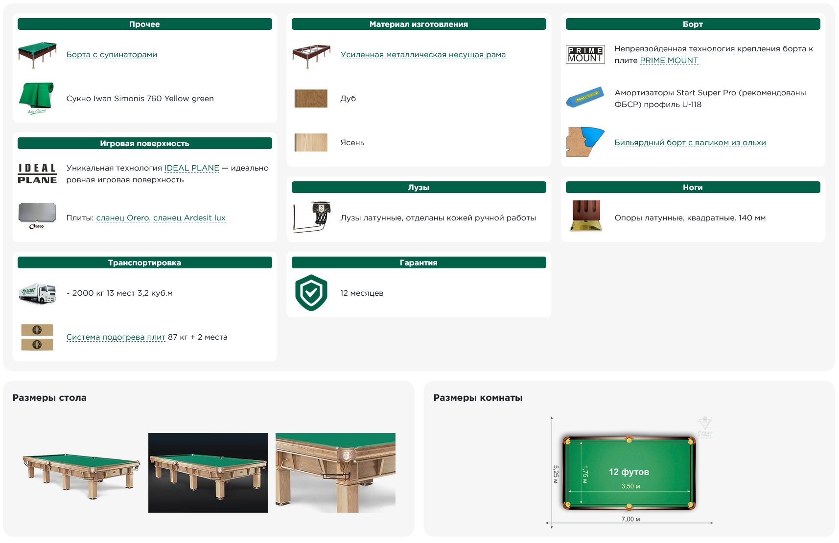 Модель также усовершенствована усиленным крепежом, в изготовлении используется исключительно массив дерева. На столе такого уровня используются только латунные скобы на лузы и латунные чашки опор, амортизаторы Start Super Pro, рекомендованные ФБСР для проведения чемпионатов. Стол выпускается только в размере 12 футов. Этот бильярд изготовлен из эксклюзивных материалов, с высочайшим уровнем качества каждого элемента, что по достоинству оценят профессионалы и суперпрофессионалы бильярдной игры!