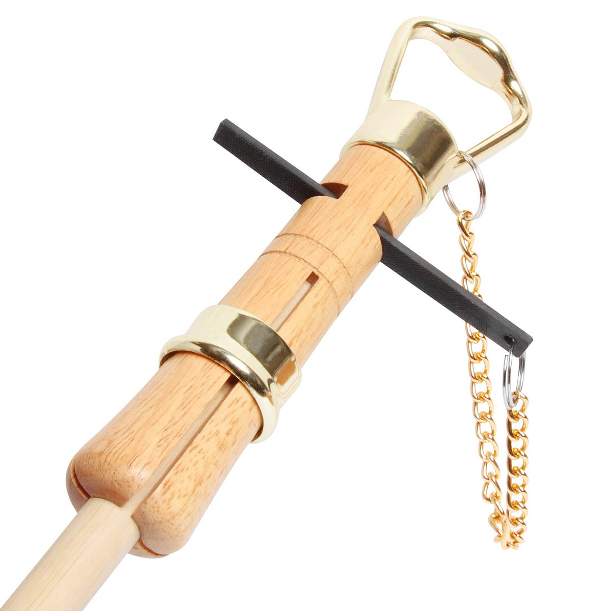 Инструмент выполняет одновременно две функции: он используется как фиксатор для приклеивания наклейки и как держатель для кия. В комплект входит металлический инструмент с абразивной поверхностью для обработки наклеек.