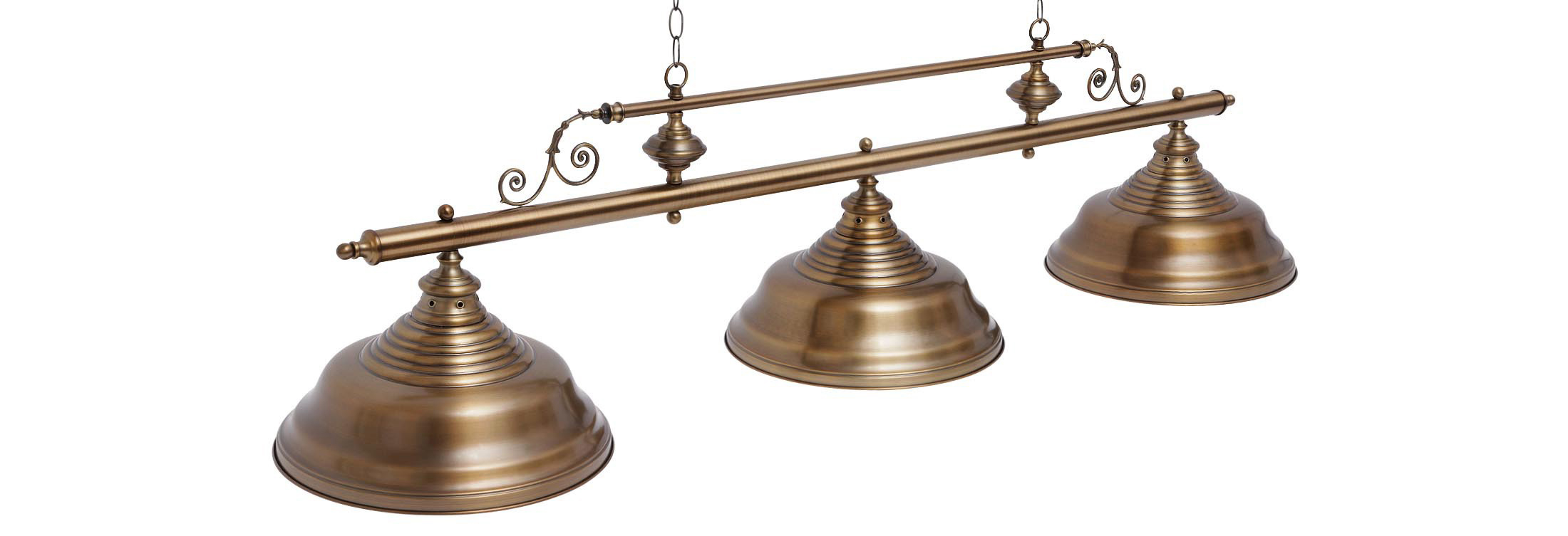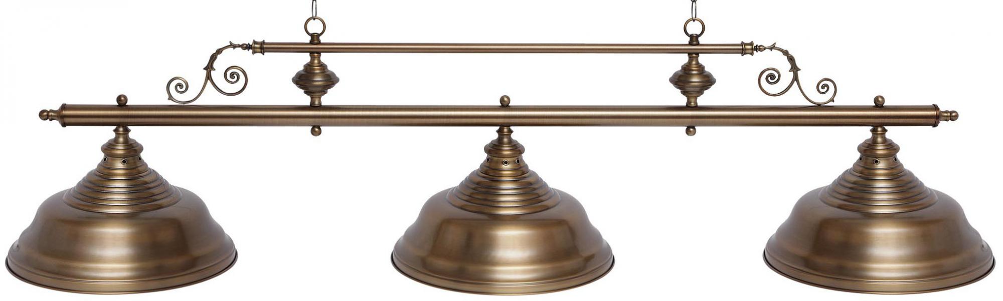 Светильник предназначен для освещения бильярдных столов размером 7-8 футов. Искусственный эффект патины подчеркивает красоту резьбы и объемную фактуру плафонов, придавая светильнику благородный вид. Штанга украшена кованными декоративными спиральными завитками и другими оригинальными фигурными элементами, которые придадут презентабельный стиль Вашему бильярдному клубу.
