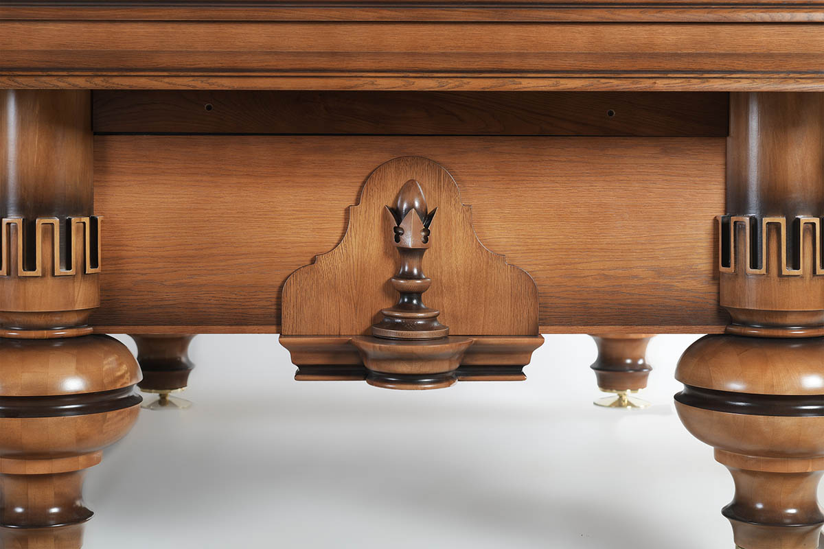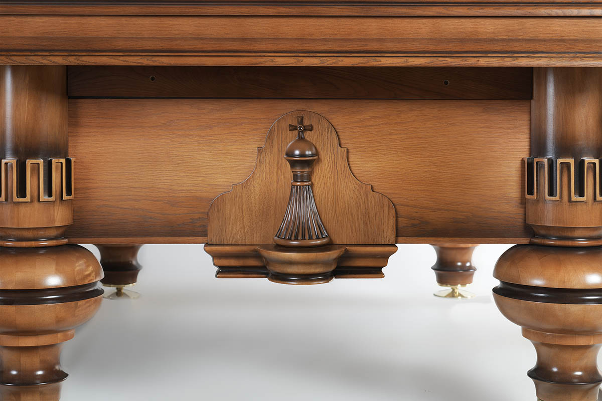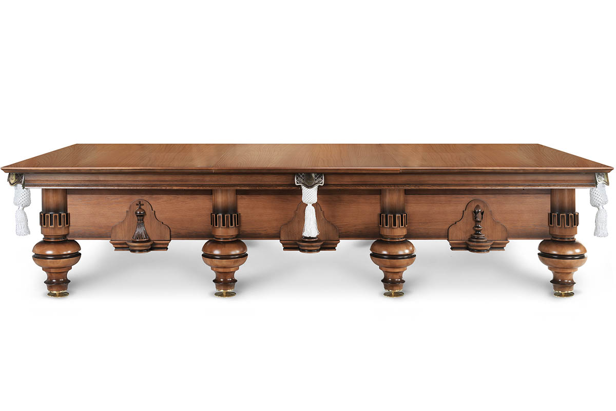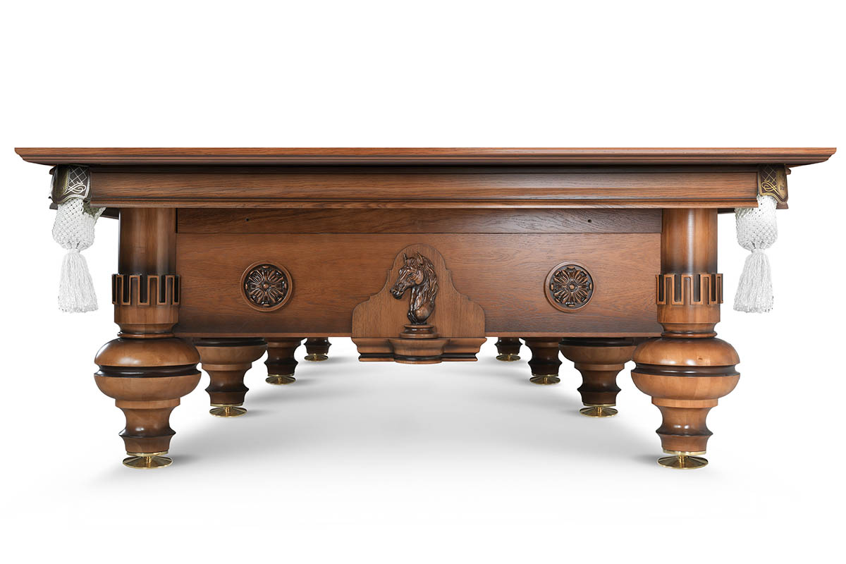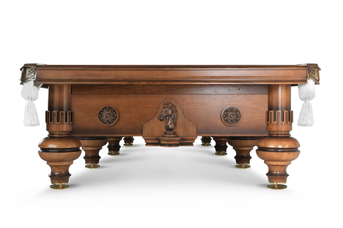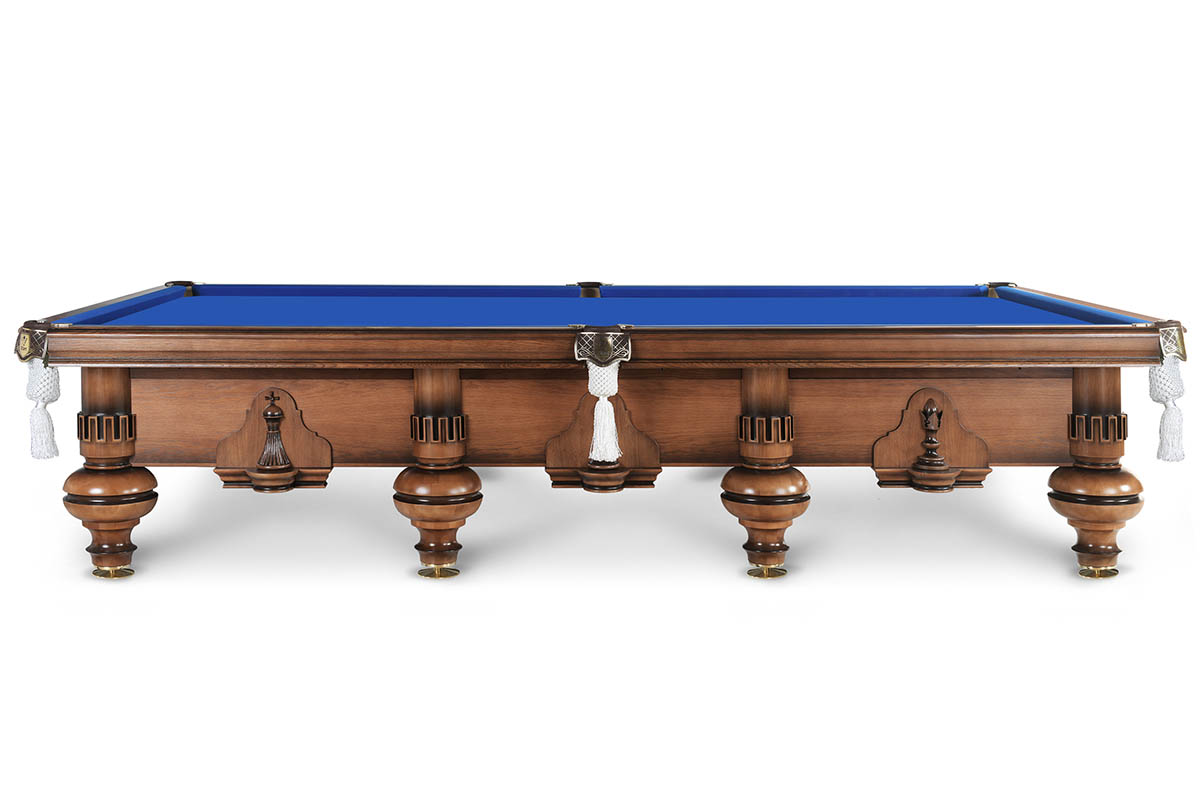 Бильярдный стол «Гроссмейстер» посвящен победам, в нем мощь сочетается с красотой и изяществом. Индивидуальная разработка для легендарной личности требует ответственного подхода и глубокого погружения. Этот бильярд вобрал в себя не только эксклюзивность комплектующих и натуральные природные материалы, но и уникальные технологии изготовления. Художественная ценность модели заключается в четком ритме резных шахматных фигур, строгих пропорциях, комбинации фактур разных пород дерева и выразительной патинированной выкраске. В построении используется технология безупречного крепления борта к плите - Mount Perfect, которая гарантирует повышенную жесткость конструкции. Лузы отделаны геральдическим тиснением, сетки ручного плетения.