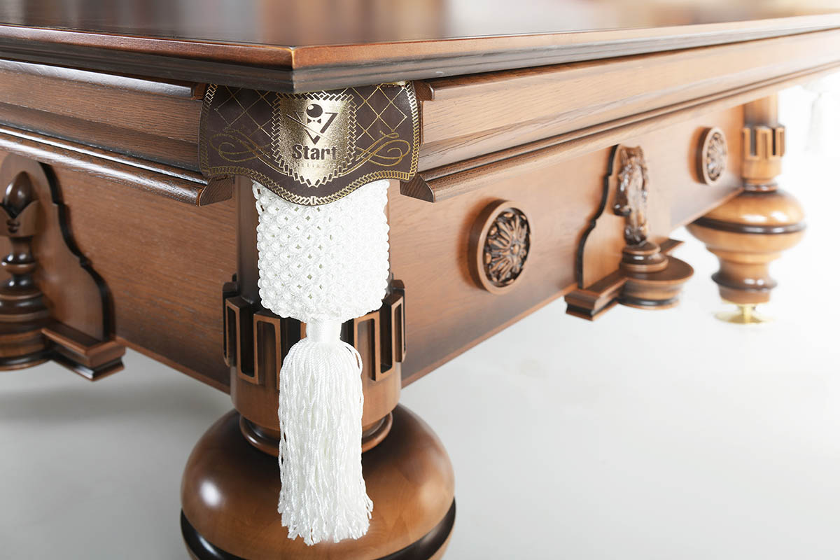 Бильярдный стол «Гроссмейстер» посвящен победам, в нем мощь сочетается с красотой и изяществом. Индивидуальная разработка для легендарной личности требует ответственного подхода и глубокого погружения. Этот бильярд вобрал в себя не только эксклюзивность комплектующих и натуральные природные материалы, но и уникальные технологии изготовления. Художественная ценность модели заключается в четком ритме резных шахматных фигур, строгих пропорциях, комбинации фактур разных пород дерева и выразительной патинированной выкраске. В построении используется технология безупречного крепления борта к плите - Mount Perfect, которая гарантирует повышенную жесткость конструкции. Лузы отделаны геральдическим тиснением, сетки ручного плетения.