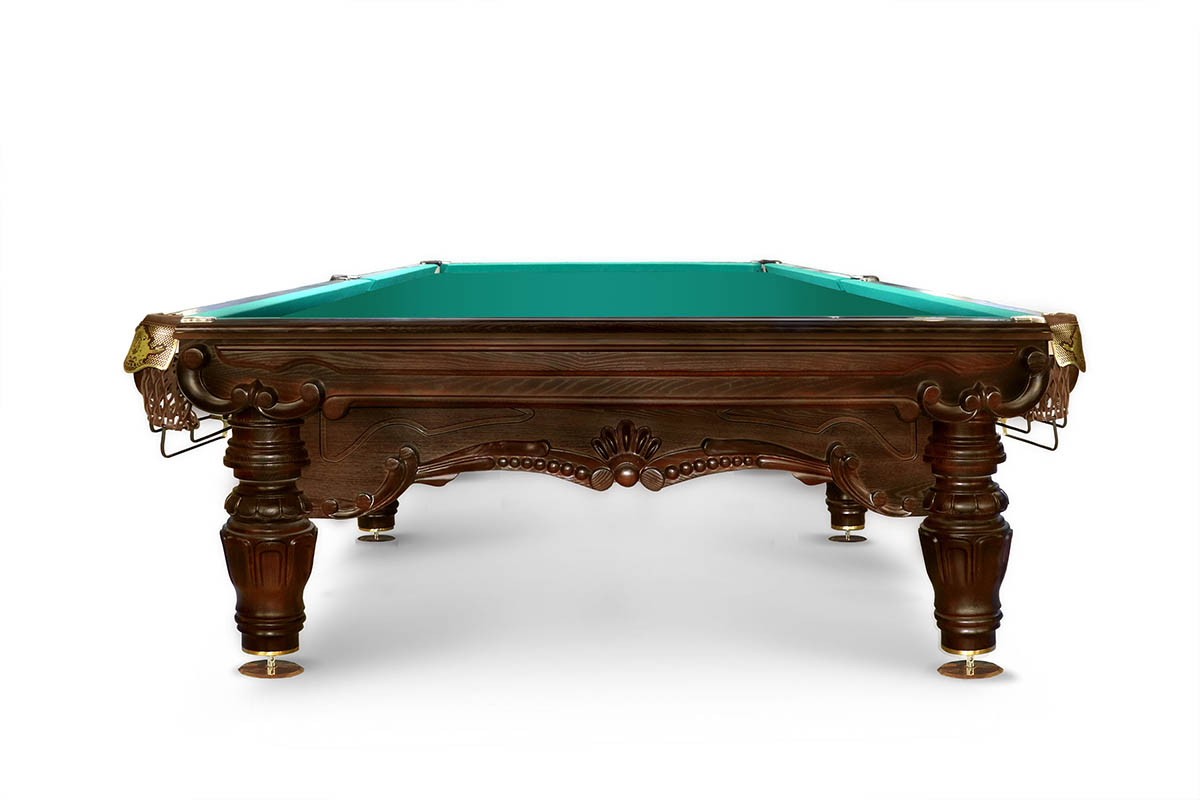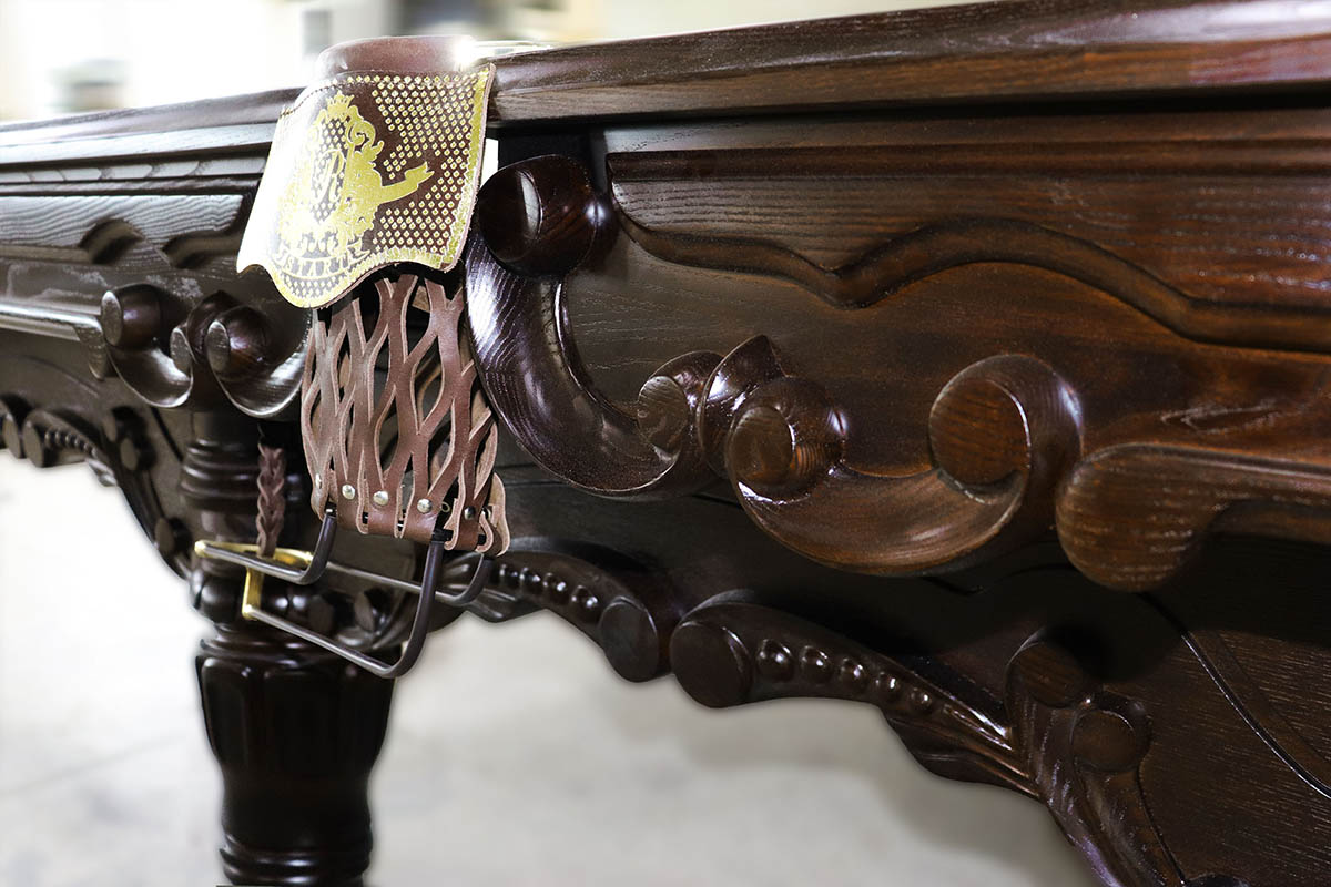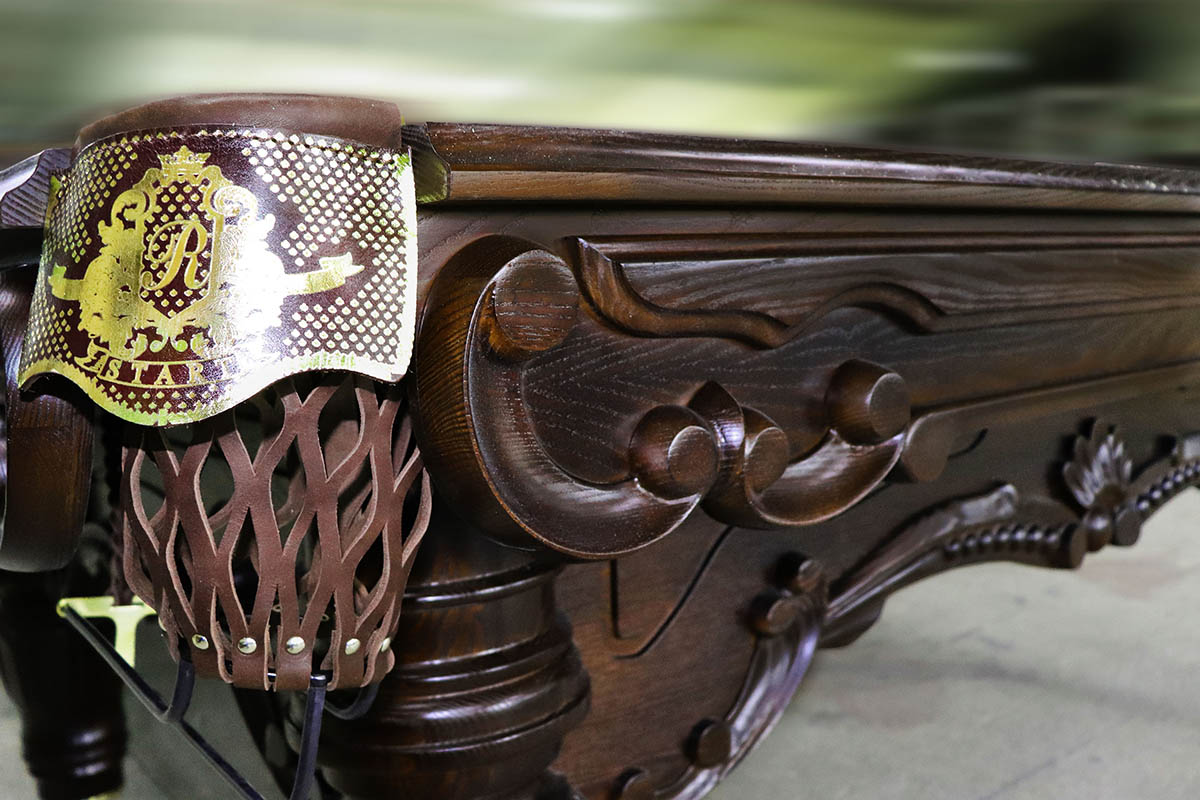 Как и другие бильярдные столы эксклюзивной серии, «Император» изготавливается из благородных пород натуральной древесины, а точнее – из массива клена или ясеня. Царское величие облику стола придают выполненные вручную резные элементы. Отделка в стиле барокко выглядит солидно, торжественно и элегантно. Интересной деталью данной модели стали и интересно оформленные ноги стола, имеющие полностью округлую верхнюю часть.
