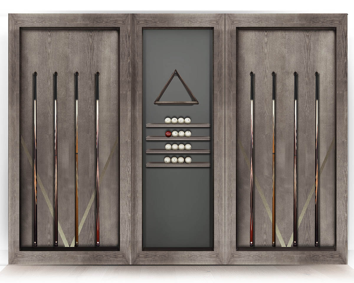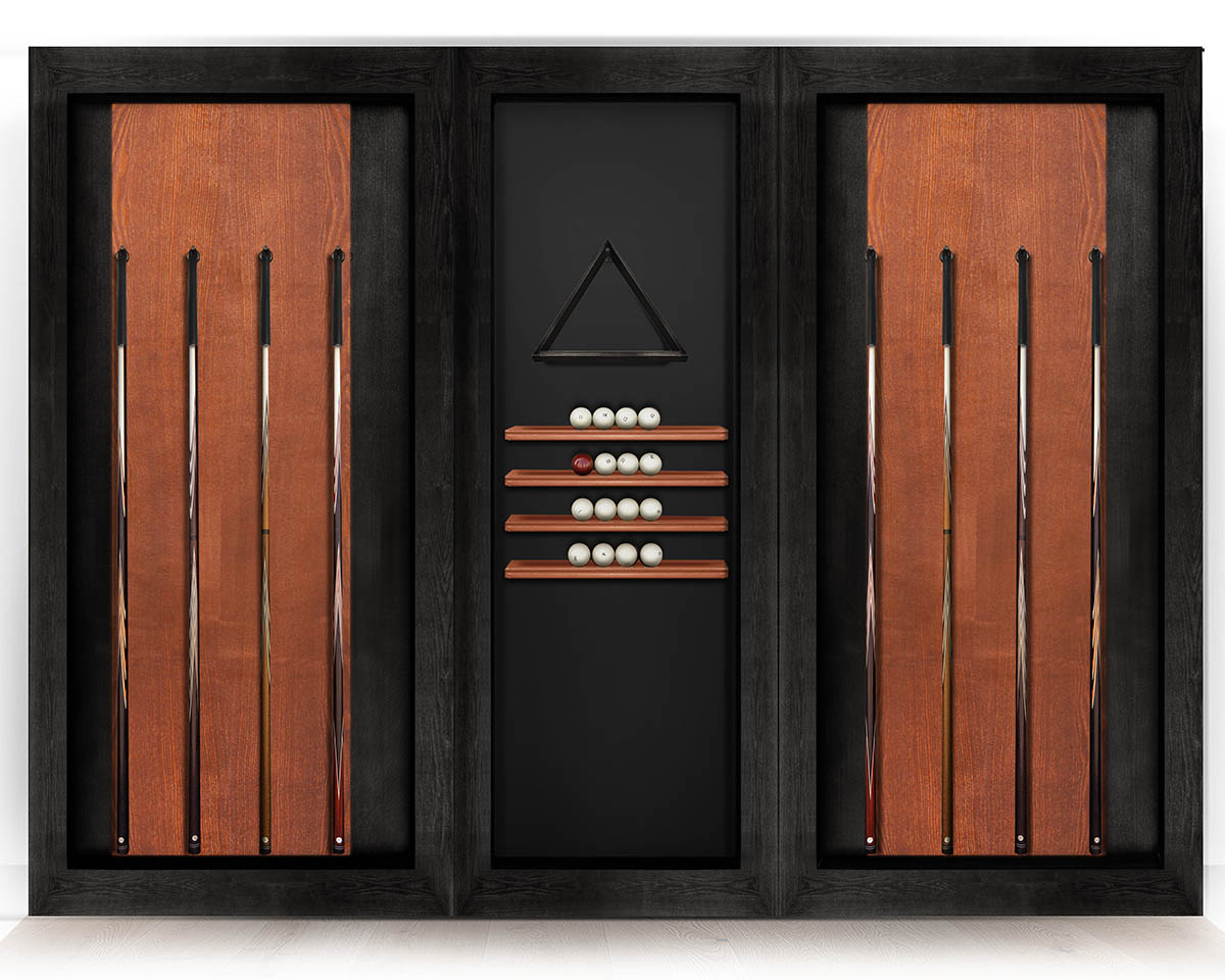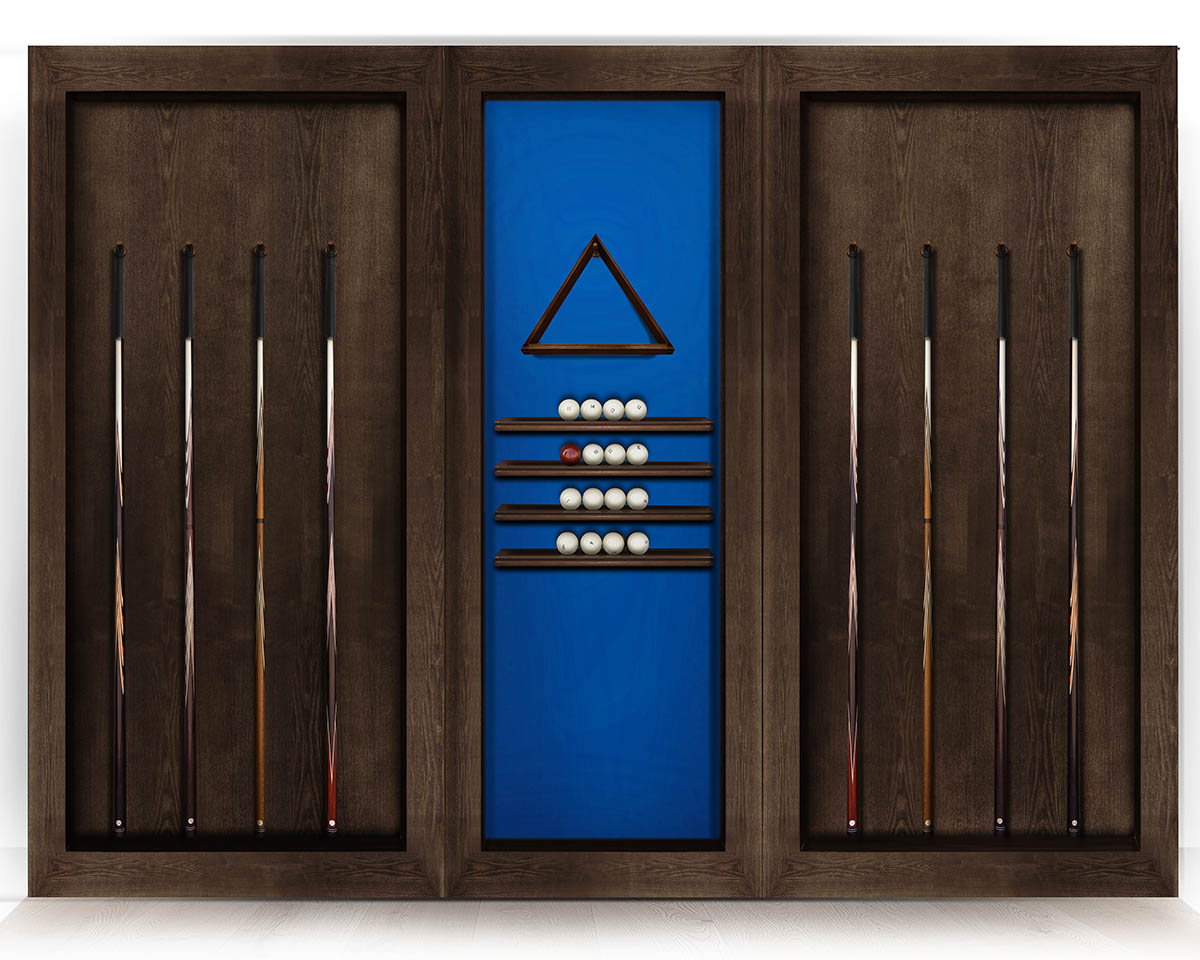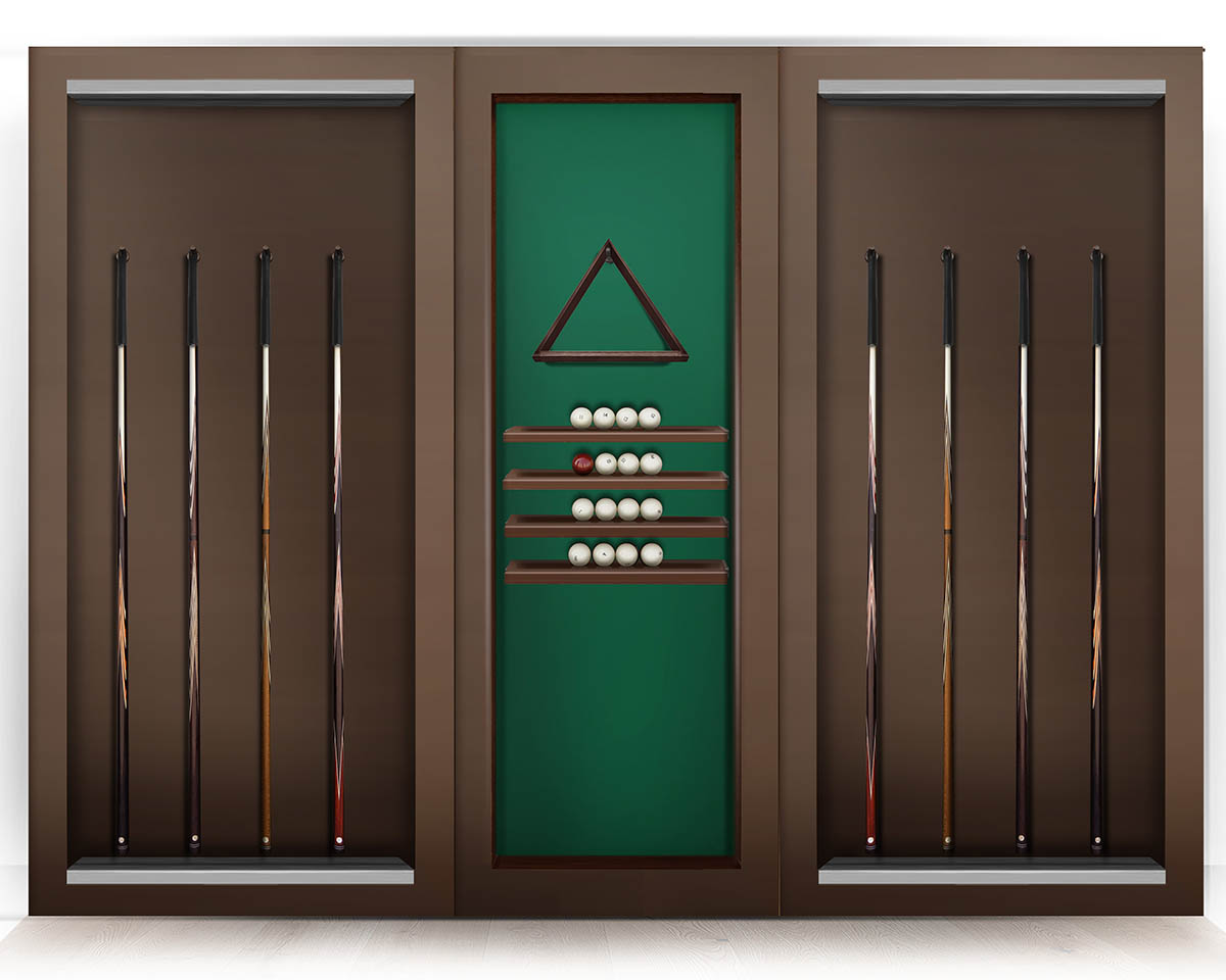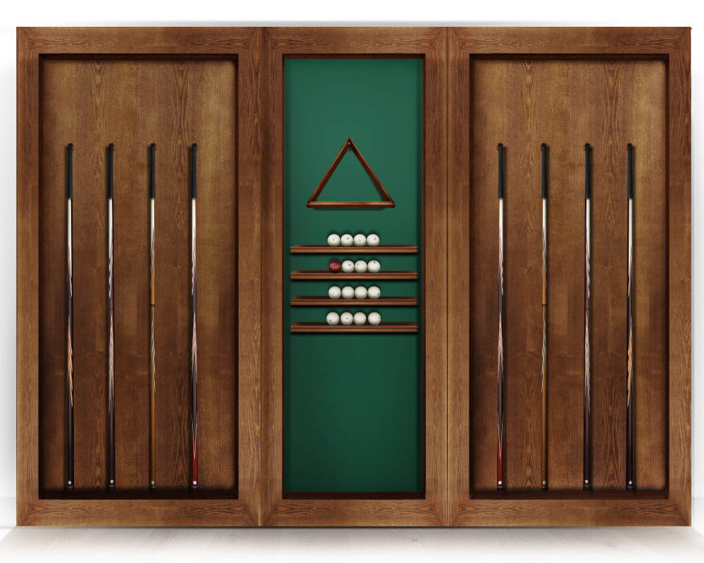 Киевница состоит из 3 частей и рассчитана для хранения 8 киев. Оснащена специальными полочками для бильярдных шаров и имеет удобный подвес, который обеспечивает легкий доступ к треугольнику для расстановки шаров. Данная киевница позволяет держать все необходимое оборудование в одном месте.