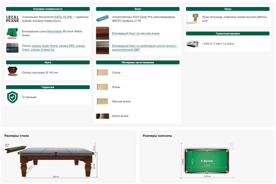 В стандартную комплектацию входит сукно с высокими эксплуатационными характеристиками бренда Manchester. Основа игрового поля выполнена из природного сланца ORERO или камня SUPER STONE.