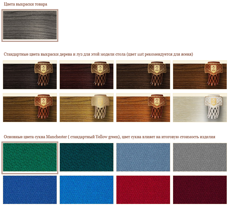 В стандартную комплектацию входит сукно с высокими эксплуатационными характеристиками бренда TAO-MI. Основа игрового поля может быть из природного сланца ORERO, камня PBS или камня SUPER STONE.