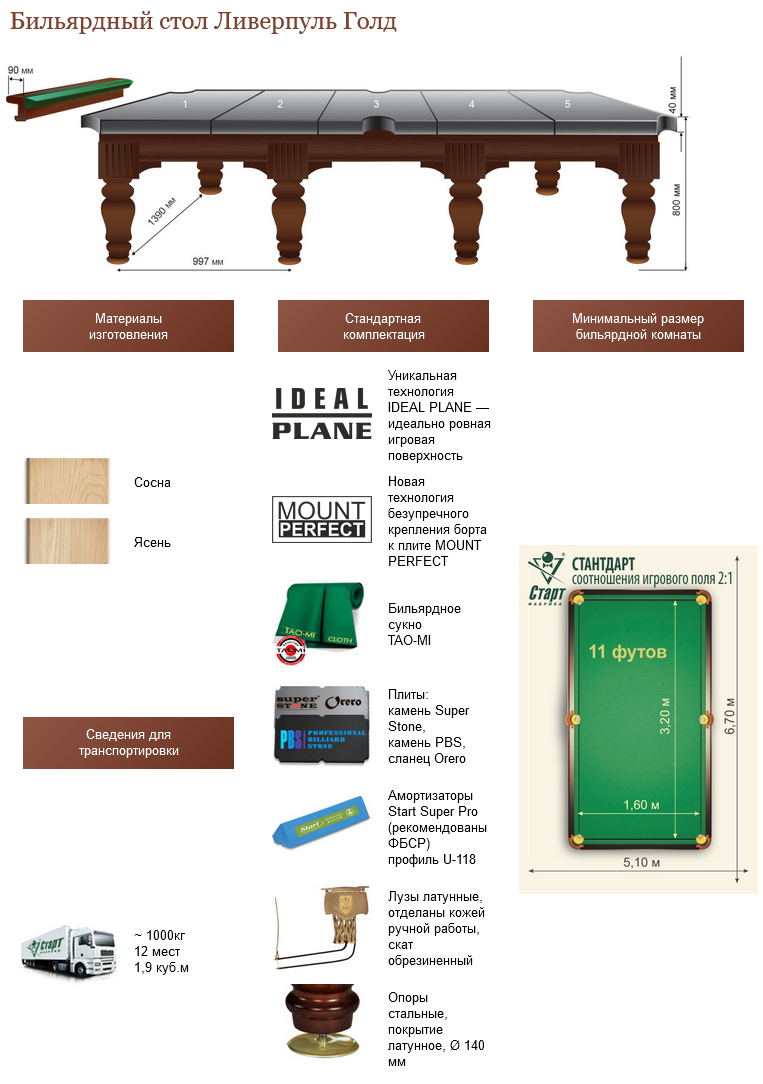 Яркий дизайн классического бильярда, безупречное качество, надежная конструкция – все эти свойства сочетаются в бильярдном столе «Ливерпуль Голд».