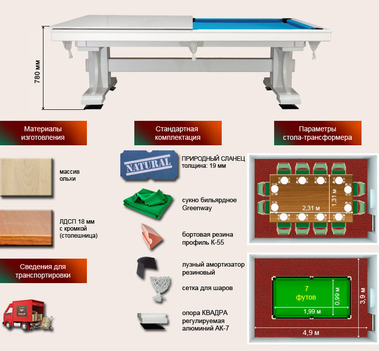 «Маэстро» не просто подарит возможность проводить время за любимой игрой в бильярд у вас дома. Он также избавит вас от необходимости занимать под ваше увлечение отдельную комнату, как это происходит с обычным бильярдом. Стол «Маэстро» может легко и непринужденно использоваться как обеденный в гостиной или письменный в рабочем кабинете.
