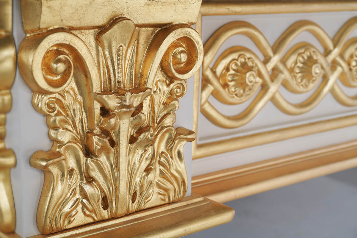Стол эксклюзивного уровня выполнен из граба, поэтому может служить веками. Антикварная выкраска выполняется вручную золотой поталью и подчеркивает весь резной декор. Уникальность стола не только во внешнем оформлении.