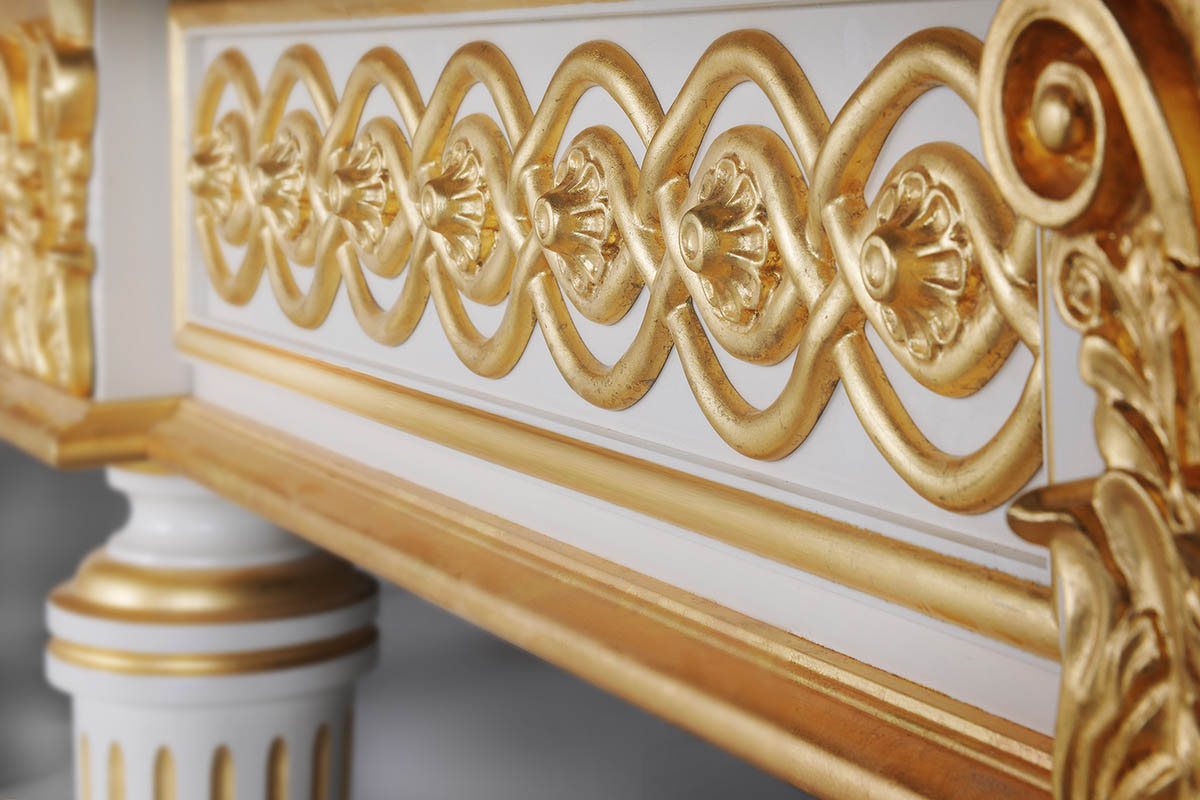 Стол эксклюзивного уровня выполнен из граба, поэтому может служить веками. Антикварная выкраска выполняется вручную золотой поталью и подчеркивает весь резной декор. Уникальность стола не только во внешнем оформлении.