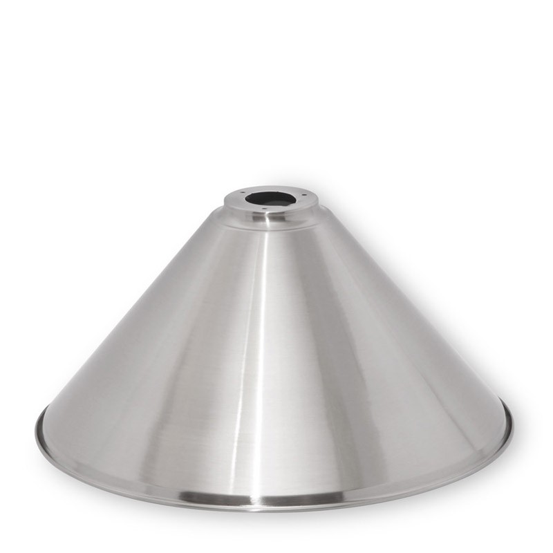 Металлический плафон стального цвета и классической конусообразной формы. Предназначен для бильярдных светильников, может использоваться в обычных интерьерных лампах совместимых конструкции и крепежа. Диаметр нижней кромки плафона - 40 см.
