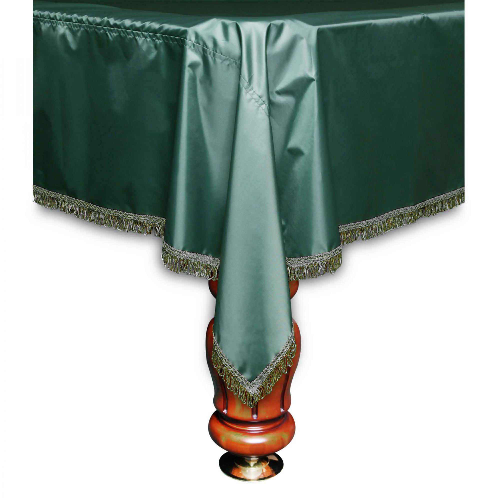 Стильное декоративное покрывало «Элегант» полностью соответствует своему названию. Зеленого цвета, украшенное зеленой бахромой, оно замечательно впишется в интерьер бильярдной комнаты, ресторана или клуба. Изделие выполнено из специально обработанного нейлона. Пропитка придает ткани водоотталкивающие свойства, делает ее более плотной и гладкой. Покрывало выкроено с таким расчетом, чтобы спускающаяся с поверхности стола ткань надежно закрывала и борта, и лузы, и часть опоры.