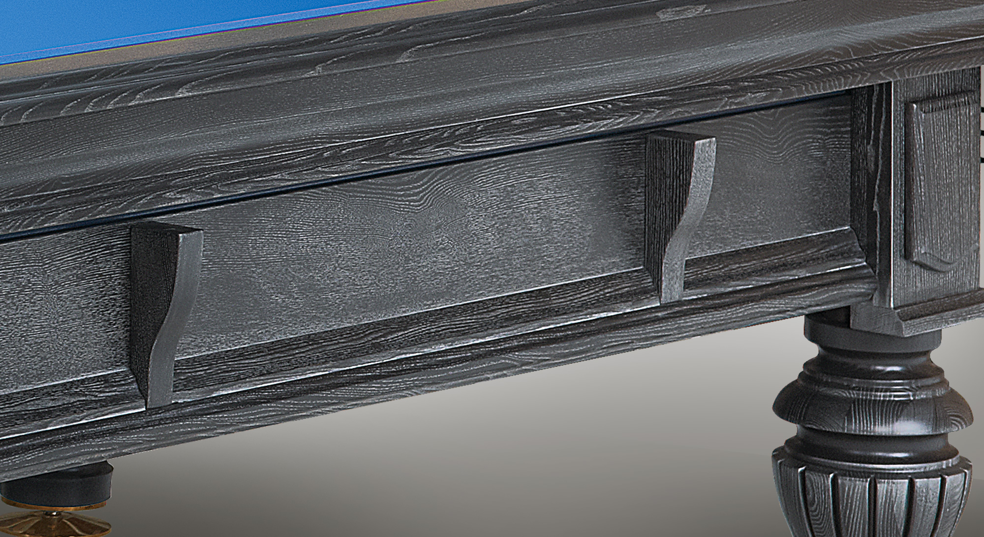 Внешнее сходство с палубой старинного судна придает бильярду технология искусственного старения дерева. Поверхность обрабатывается в 5 этапов. Для начала основу стола нужно тщательно загрунтовать и вручную отшлифовать. Следующий этап – нанесение лака и краски насыщенного темно-пепельного оттенка. После этого можно переходить к отделке серебром: мастера Фабрики вручную втирают серебряную пасту в деревянную поверхность, чтобы заполнить все поры натурального материала. Благодаря шлифовке сукном лучше проявляется фактура дерева. Финишное покрытие лаком закрепляет эффект.