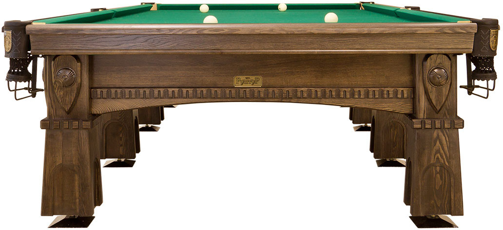 Настоящий русский стол с мощной конструкцией и весьма необычной для бильярдных столов формой ножек. Конверты на ножках выполнены в виде щита русского витязя.