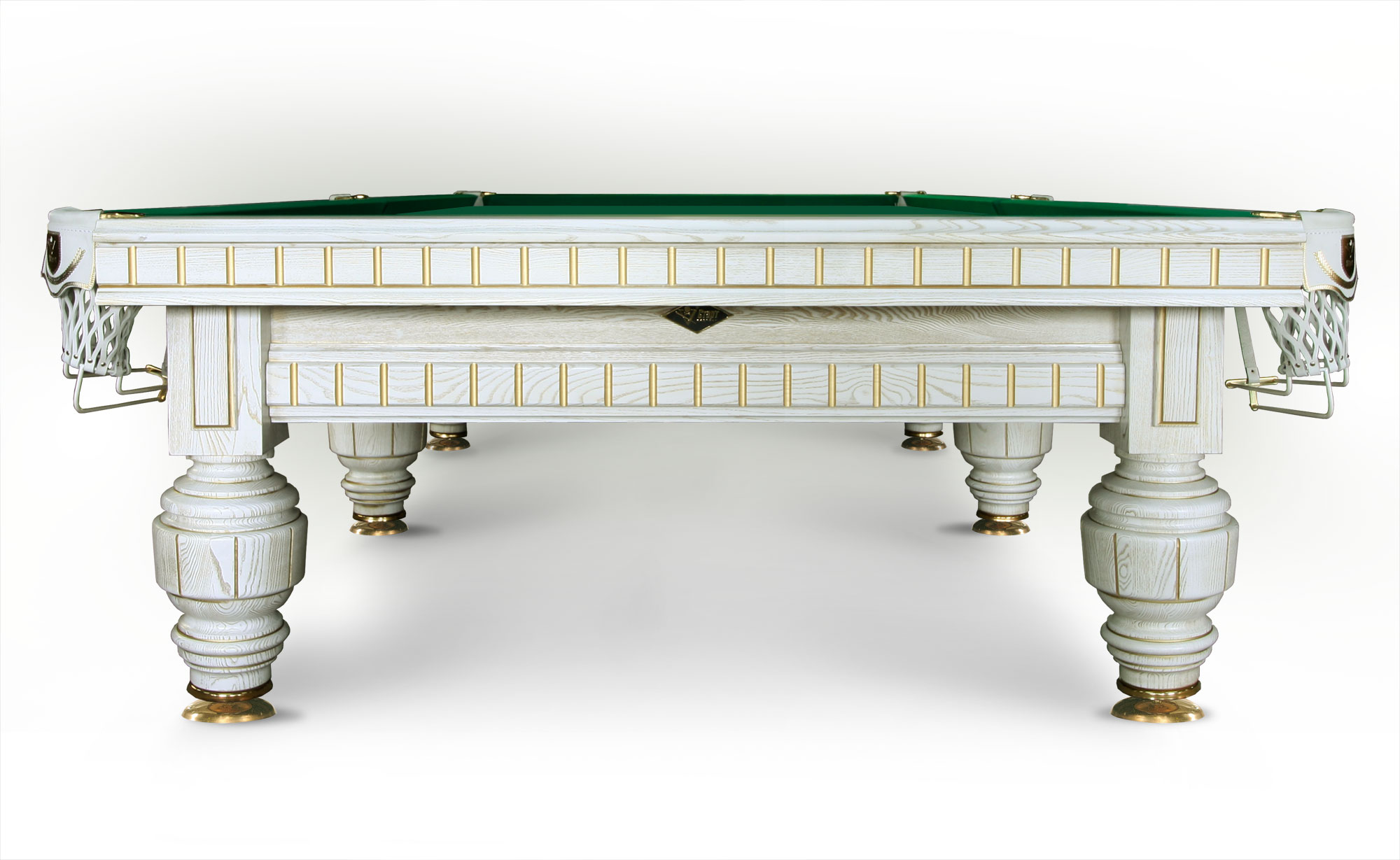Стабильность конструкции обеспечивает «шульцевское» крепление ног с царгами и увеличенный диаметр опор. Несущая рама, оснащенная 36-ю юстировочными точками, позволяет идеально отрегулировать игровую поверхность стола. Лафет и ноги декорируются необычными резными элементами.