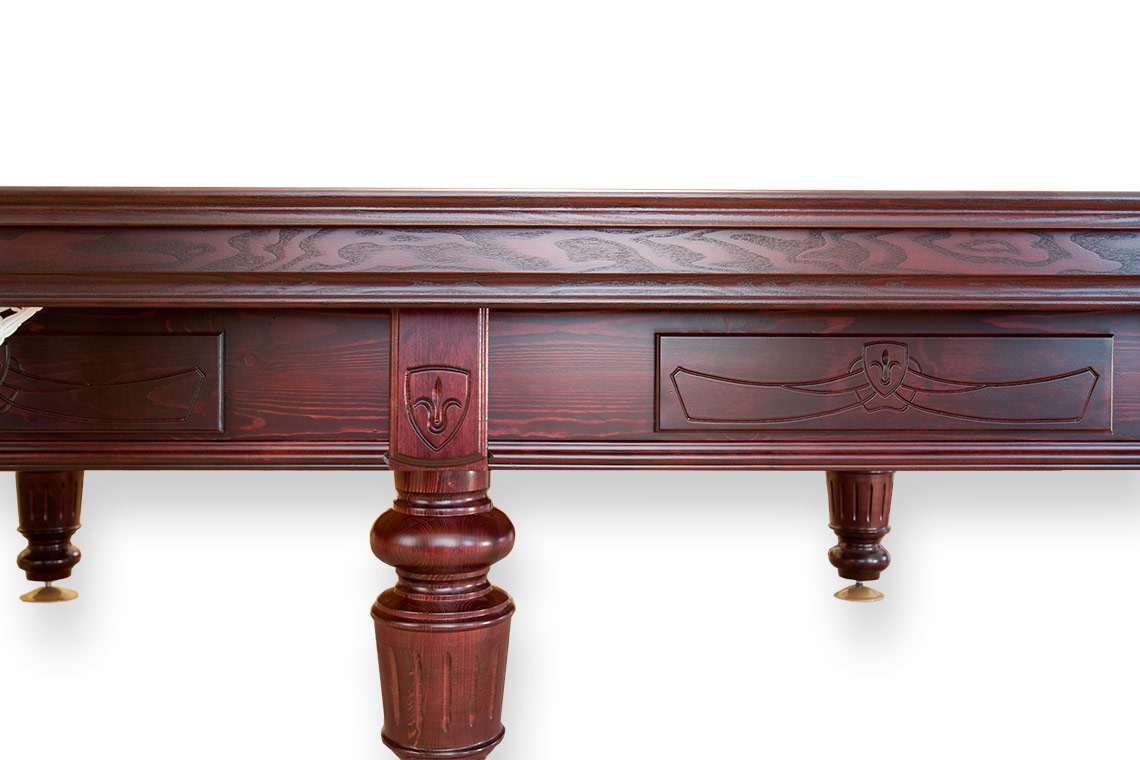 Стол «Шевалье» является одним из самых ярких представителей своей серии. Его конверты и царги лафета покрыты резьбой с элементами, стилизованными под старинный дворянский герб. Ноги из отборного массива сосны с легкостью несут мощный сосновый каркас и плиты натурального сланца. При этом они выглядят весьма грациозно за счет точеного рельефа и вертикальных резных канавок. Прочные опоры ног, борта из ясеня, лузы с кожаными пелеринами, качественное сукно — недорогая стандартная комплектация оптимальна для организации домашнего бильярда.