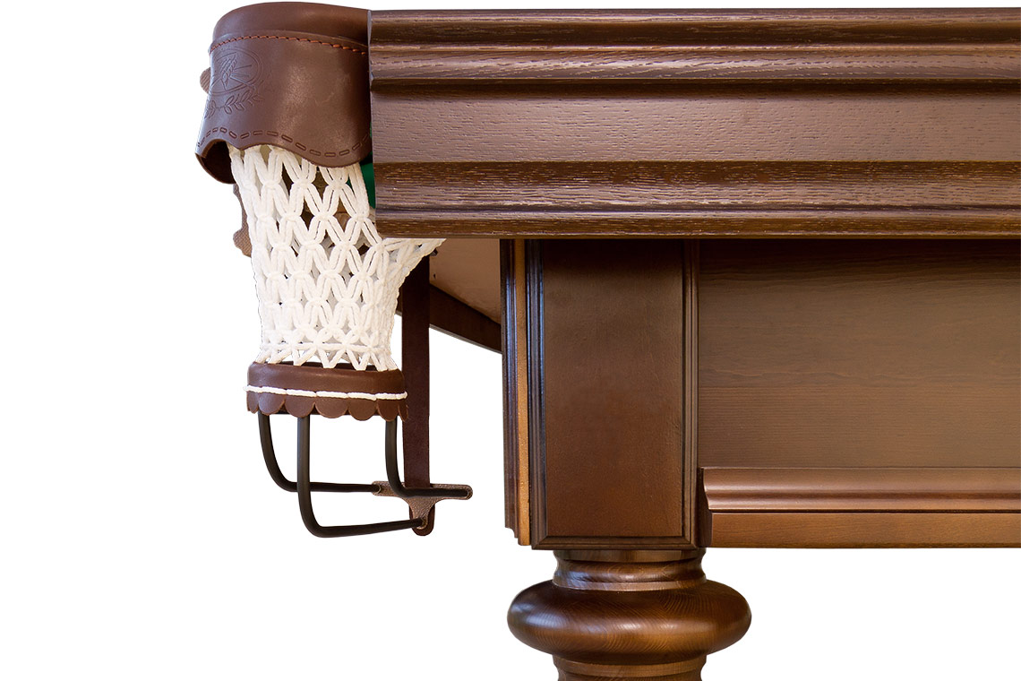 Борта из ясеня, латунные опоры, качественное сукно — даже стандартная комплектация стола обеспечивает игровую практику на уровне, вплотную приближающемся к профессиональному. Точеные формы и резной декор ног соответствуют представлению покупателей об оформлении изысканной домашней бильярдной.