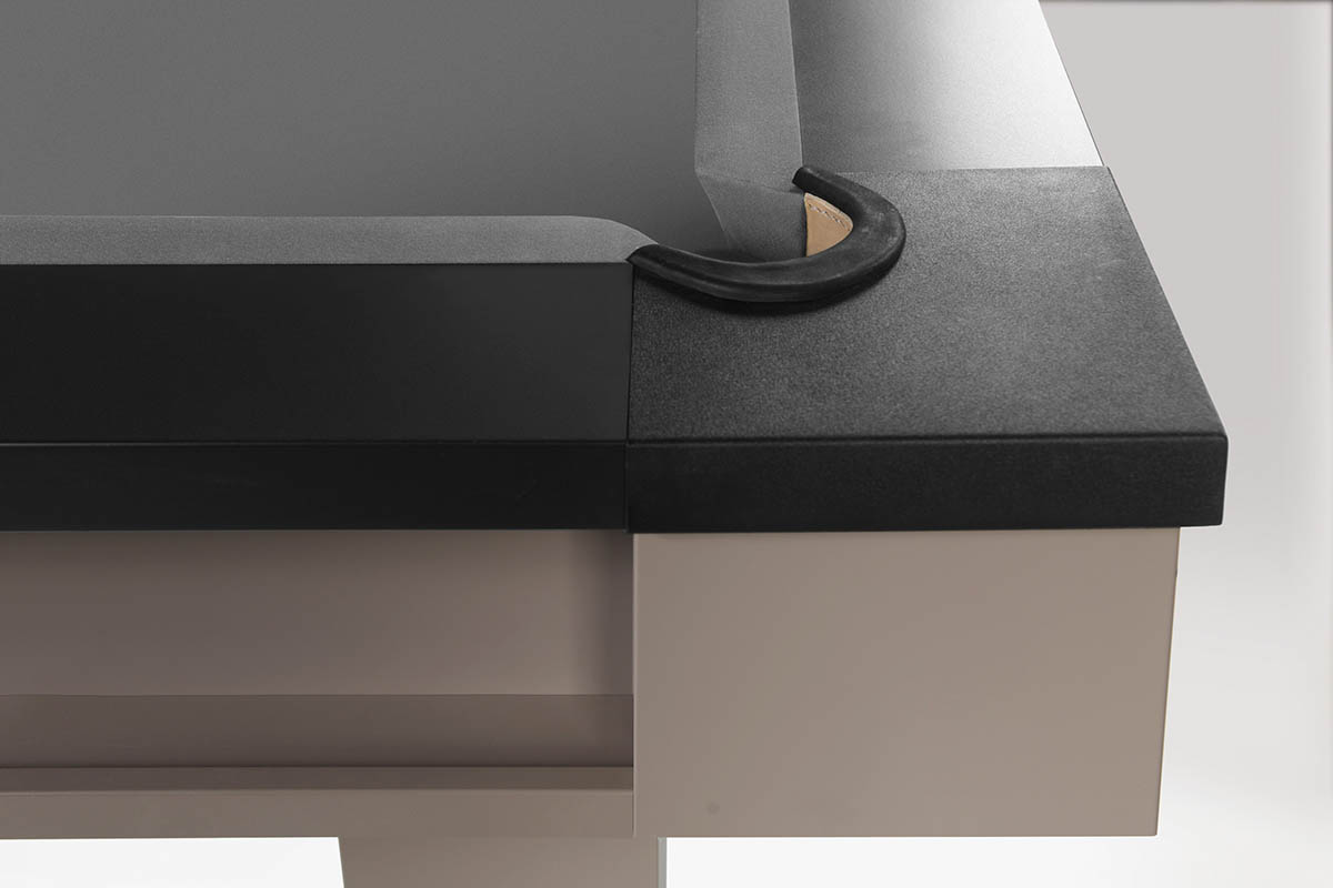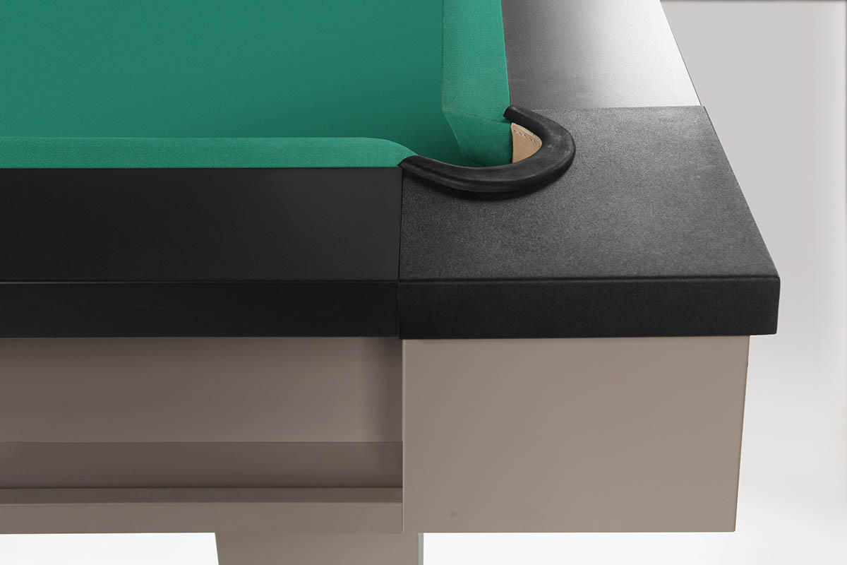 Луза: вазон, скоба кожаная с металлической накладкой, отличается долговечностью и добавляет элегантности бильярдному столу. Боковые накладки из металла, обработанные под шагрень, формируют завершенный и презентабельный вид. Уникальная конструкция стола предусматривает балконы, расположенные по периметру лафета, предназначенные для хранения шаров. Такое решение работает на внешнюю эксклюзивность стола и позволяет сохранить порядок в бильярдной зоне.