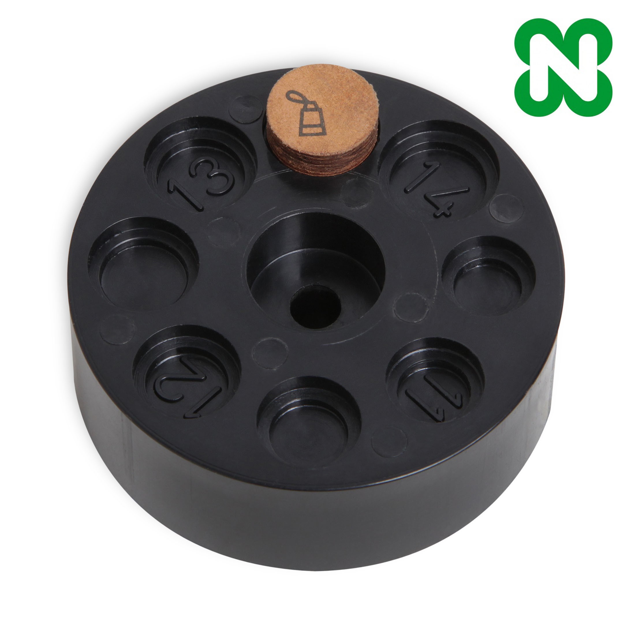 Станок Jolly Cue состоит из трех частей: фиксатора, в котором устанавливается обрабатываемый шафт; диска со сменной абразивной поверхностью; барабана с находящимися в нем углублениями, нишами для установки наклеек.