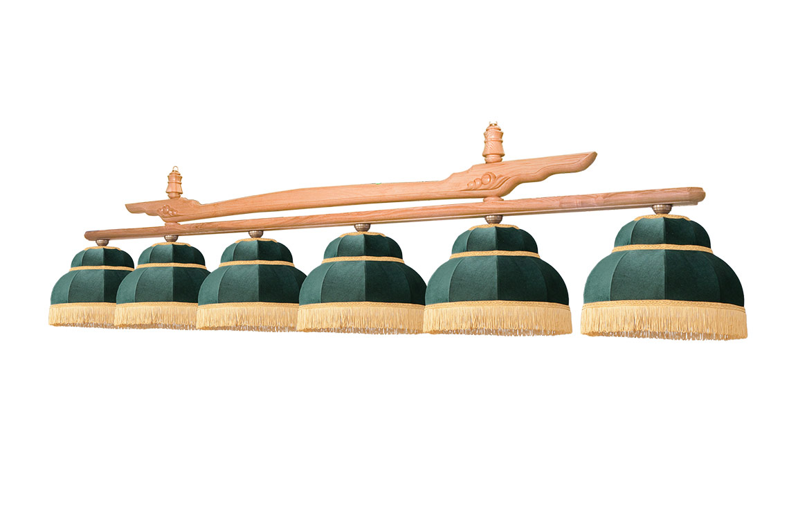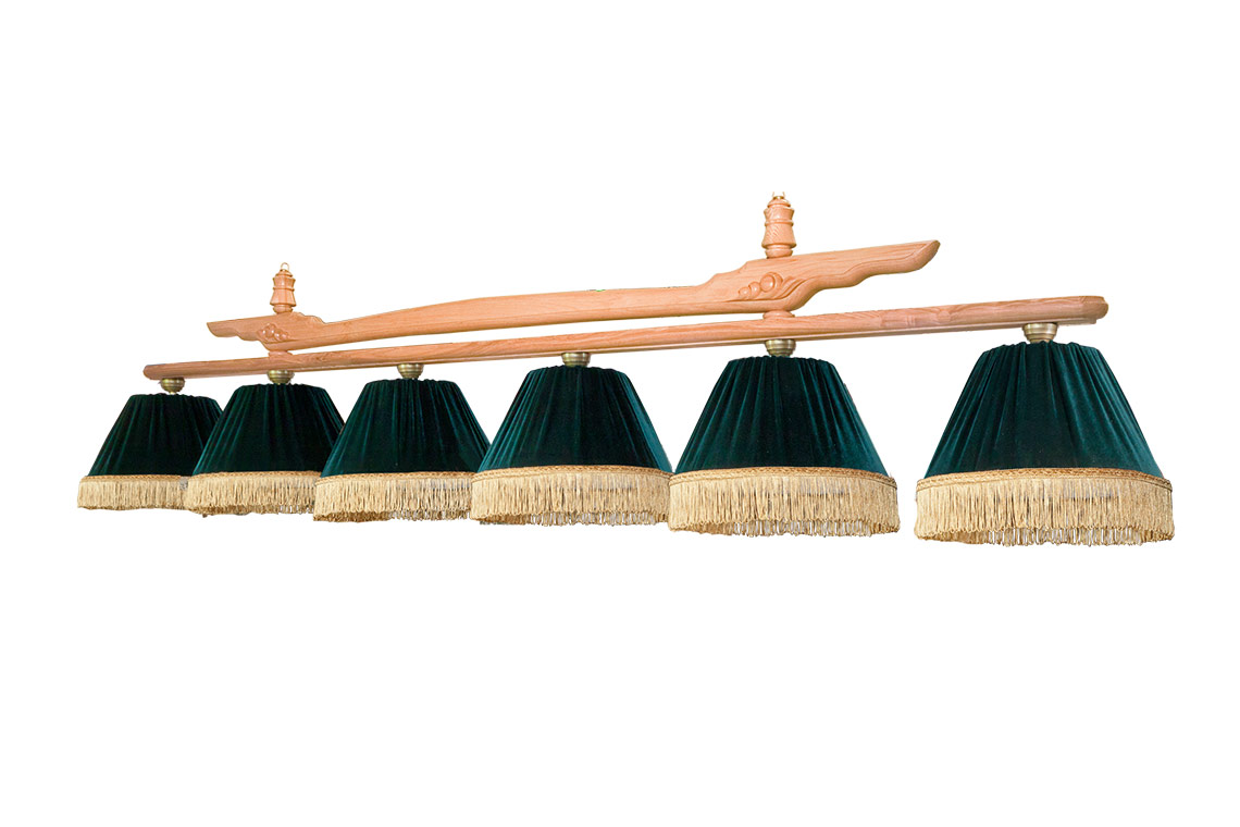 Бильярдный, коллекционный светильник «Адмирал» от компании «Руптур» – эстетичный и функциональный аксессуар, равномерно освещающий поверхность стола и создающий уютную обстановку для отдыха и игры. Элегантный подвес выполнен из массива дуба или ясеня. Верхняя балка украшена симметричным резным узором. Для светильника можно выбрать плафоны из пяти моделей: бархатные с золотой бахромой «Уют» и «София» или «Венеция», «Барселона», «Александрия» из двухслойного полистирола. Количество плафонов – 5 или 6 для 10 и 12-футовых бильярдов соответственно. Для оптимального освещения игрового поля без бликов рекомендуется устанавливать светорассеивающие лампочки мощностью до 75 Ватт, имеющие матовое покрытие. Светильник «Адмирал» является частью одноименной коллекции, являясь важным предметом в декорировании бильярдного помещения, а именно его игровой зоны. Элегантный аксессуар подчеркивает изысканность коллекционной мебели и гармонизирует интерьер, создавая теплоту и уют благодаря мягкому, рассеянному свету. Светильник сертифицирован в соответствии с техническими регламентами Таможенного союза, что является свидетельством его первоклассного качества, надежности и долговечности.