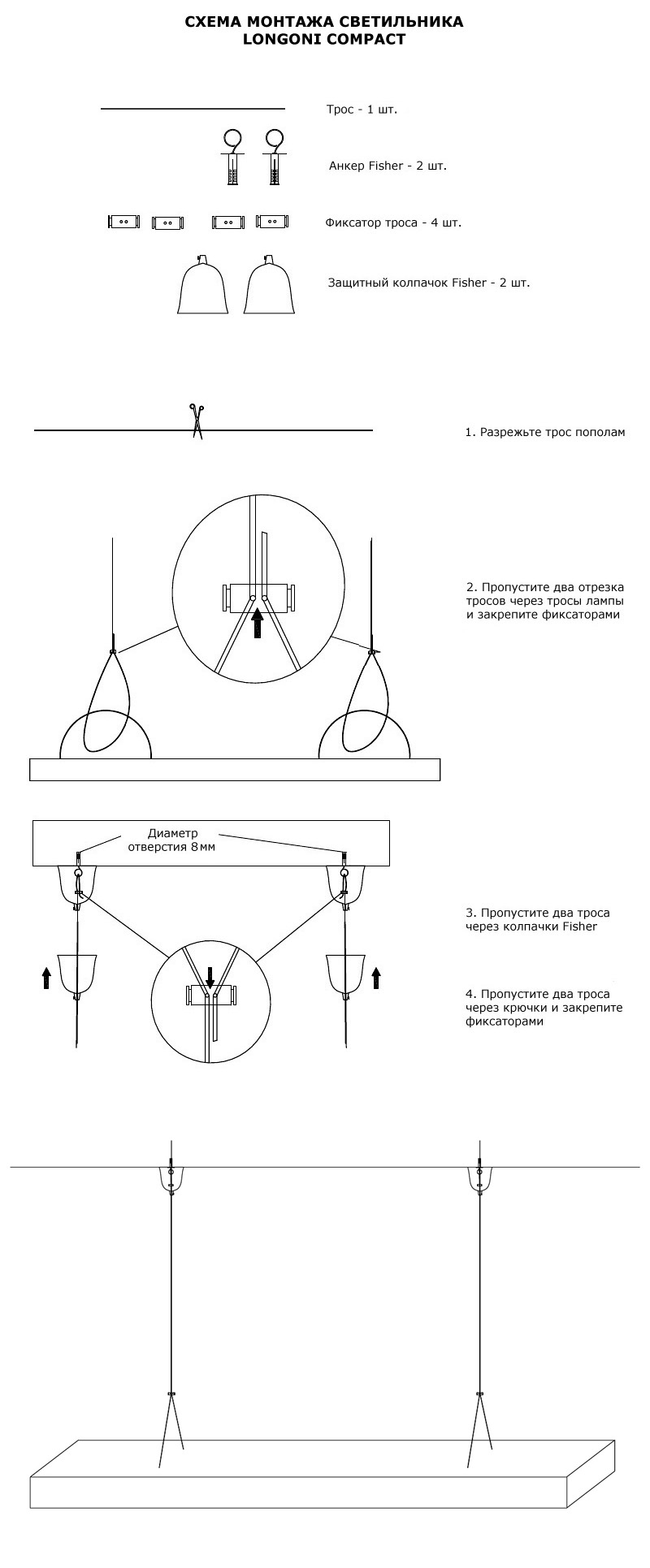 Монтаж светильника Longoni Compact над бильярдным столом осуществляется с помощью тросов и фиксаторов. Простая схема монтажа позволяет быстро установить светильник на требуемую высоту и выровнять его в горизонтальной плоскости.