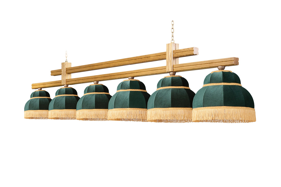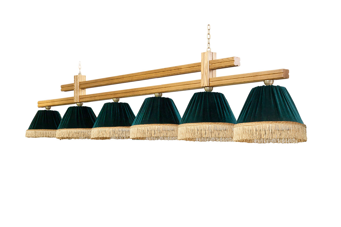 Светильник «Спортклуб» – профессиональный аксессуар от компании «Руптур» из одноименной серии, который гармонично впишется в интерьер коммерческой и домашней бильярдной, обеспечивая качественное и равномерное освещение игрового поля. Двойной подвес из прямоугольных балок выполнен из массива дуба, ясеня или ольхи– прочной древесины с длительным сроком службы. Для светильника «Спортклуб» можно выбрать плафоны из пяти вариантов: бархатные с золотой бахромой «София» и «Уют» или «Венеция», «Александрия» и «Барселона» из двухслойного полистирола. Количество плафонов составляет от 3 до 6 и выбирается в зависимости от габаритов стола. Для оптимального освещения игрового поля без бликов рекомендуется устанавливать светорассеивающие лампочки мощностью до 75 Ватт, имеющие матовое покрытие. Лаконичный дизайн без лишних элементов и декора – это отличительная черта всей коллекции «Спортклуб», призванной создавать оптимальную обстановку для профессиональной игры и массовых чемпионатов. Светильник создает идеальное освещение игрового поля и дополняет строгий стиль бильярдной коллекции «Спортклуб». Светильник сертифицирован по техническим регламентам Таможенного союза, что является подтверждением его безупречной эксплуатации в течение длительного периода времени.