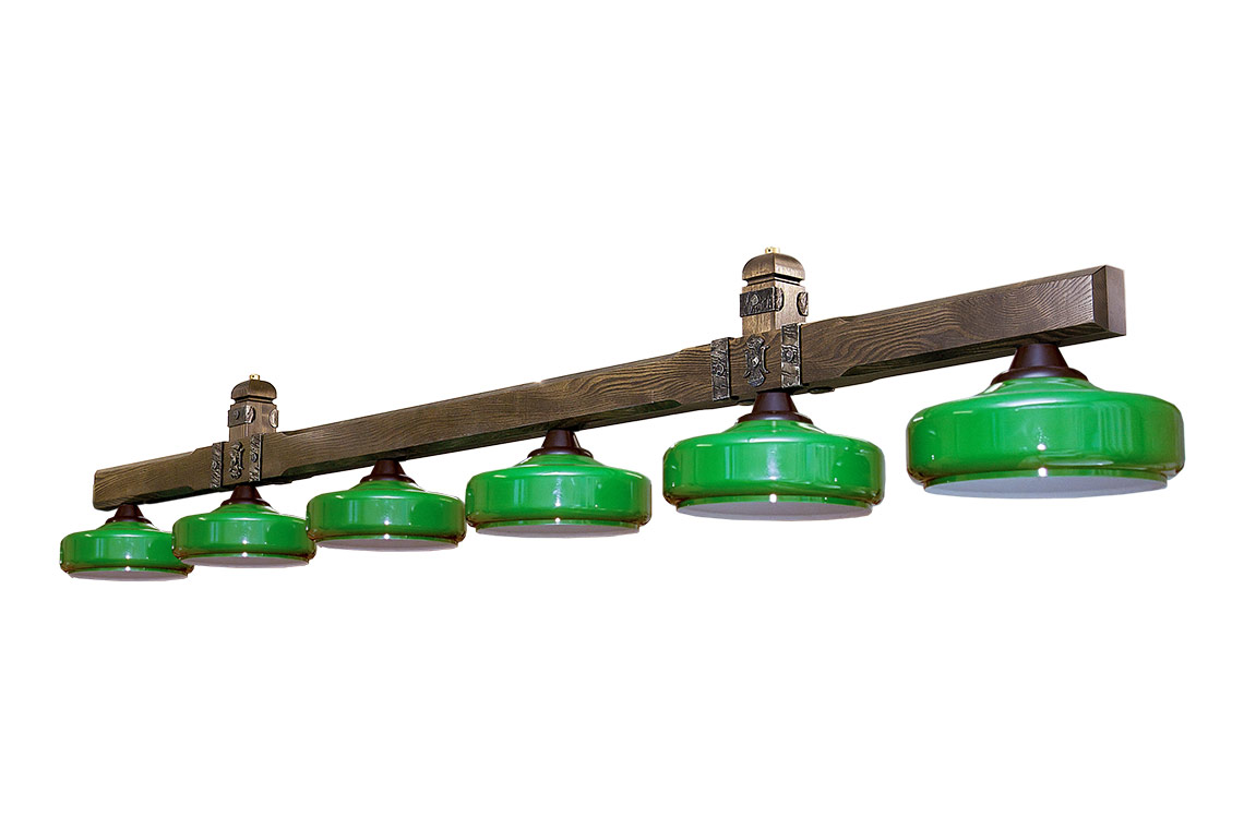 Светильник «Витязь» – это один из ключевых элементов одноимённой коллекционной серии от компании «Руптур», обеспечивающий качественное освещение поверхности стола и создающий уютную обстановку в игровом помещении. Подвес, состоящий из одной балки, выполнен из массива дуба или ясеня и декорирован металлическими накладками, напоминающими средневековые кованные элементы. Для светильника «Витязь» можно выбрать плафоны из пяти серий: бархатные с золотой бахромой «София» и «Уют» или «Венеция», «Александрия» и «Барселона» из двухслойного полистирола. Количество плафонов составляет от 3 до 6 и выбирается в зависимости от габаритов стола. Для оптимального освещения игрового поля без бликов рекомендуется устанавливать светорассеивающие лампочки мощностью до 75 Ватт, имеющие матовое покрытие. Массивные, несколько грубоватые элементы, характерные для всей коллекции «Витязь», прослеживаются и в дизайне светильника. Элитная коллекционная мебель призвана создать уникальную древнерусскую этническую обстановку в домашней бильярдной комнате. Светильник сертифицирован по техническим регламентам Таможенного союза, что является лучшей гарантией длительной и безупречной эксплуатации на длительный срок.