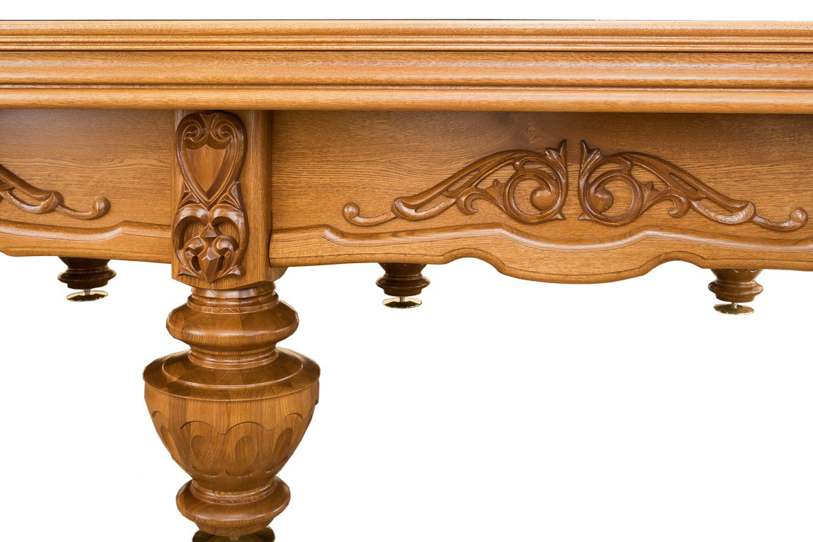 Стол украшен множеством резных накладок, а массивные, словно античные капители, ножки добавляют бильярду помпезности. Благодаря особой полировке и специальной лакировке хорошо просматривается текстура древесины. Соблюдены все параметры спортивного бильярда.