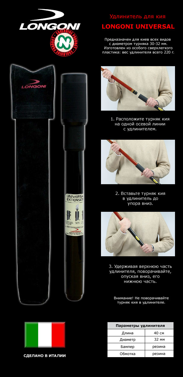 Удлинитель для кия Longoni Universal от известного итальянского производителя бильярдных киев и аксессуаров. Предназначен для киев с диаметром турняка 30-32 мм. Вес удлинителя составляет всего 220 гр.