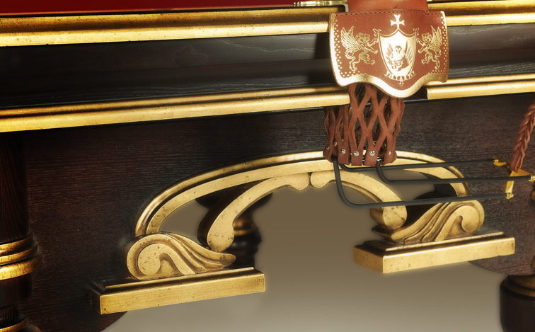 Выполненный в запоминающемся венецианском стиле бильярдный стол отличается не только великолепным внешним видом, но и высокотехнологичной конструкцией. Встроенный металлический каркас придает оптимальную устойчивость лафету. Стабильность всей конструкции усиливают увеличенные в диаметре винты ног и литые опорные чашки, изготовленные из латуни. Благодаря юстировочной системе поверхность стола идеально сохраняет горизонтальное положение. В качестве основы игрового поля использован 45-милиметровый сланец Orero-lux.
