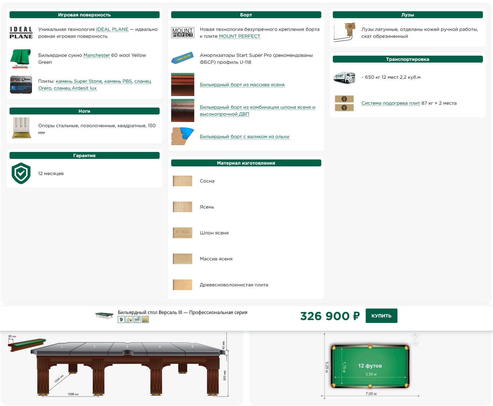 Основа игрового поля может быть выполнена из природного сланца ORERO, Orero lux или камня SUPER STONE . Стандартная комплектация сукном Manchester Lux.
